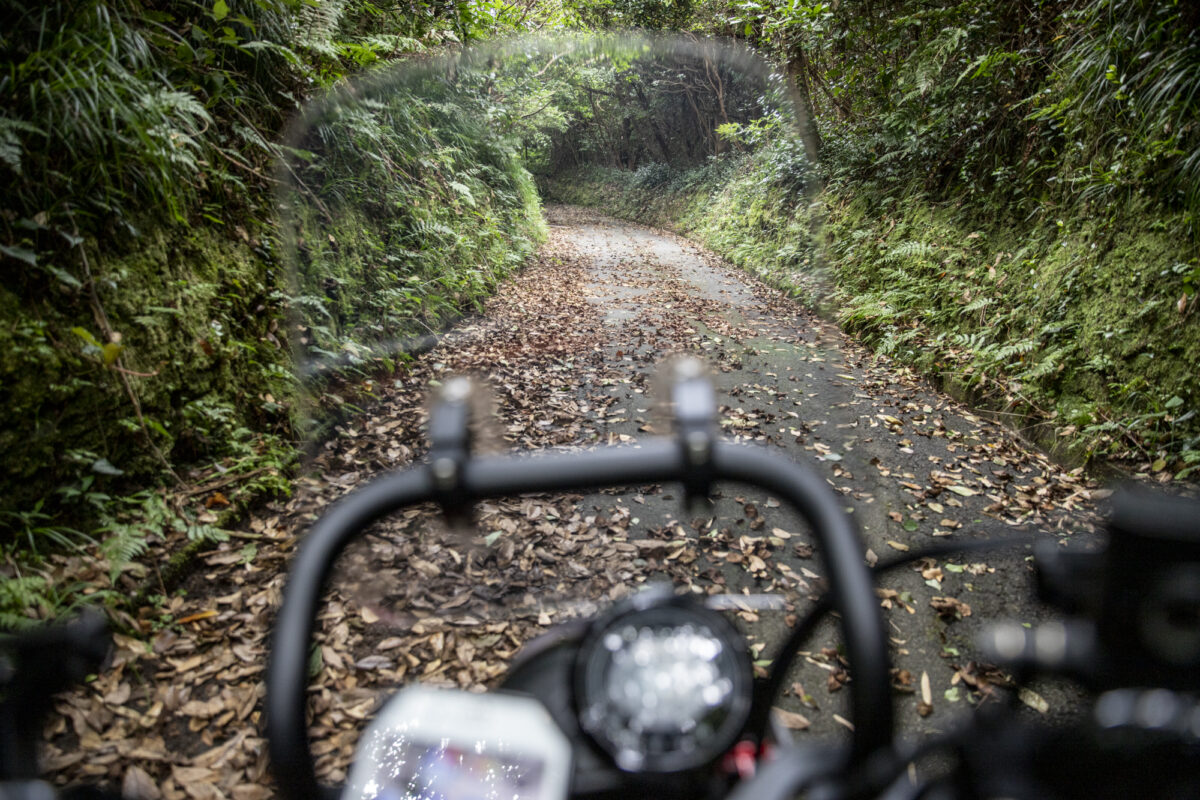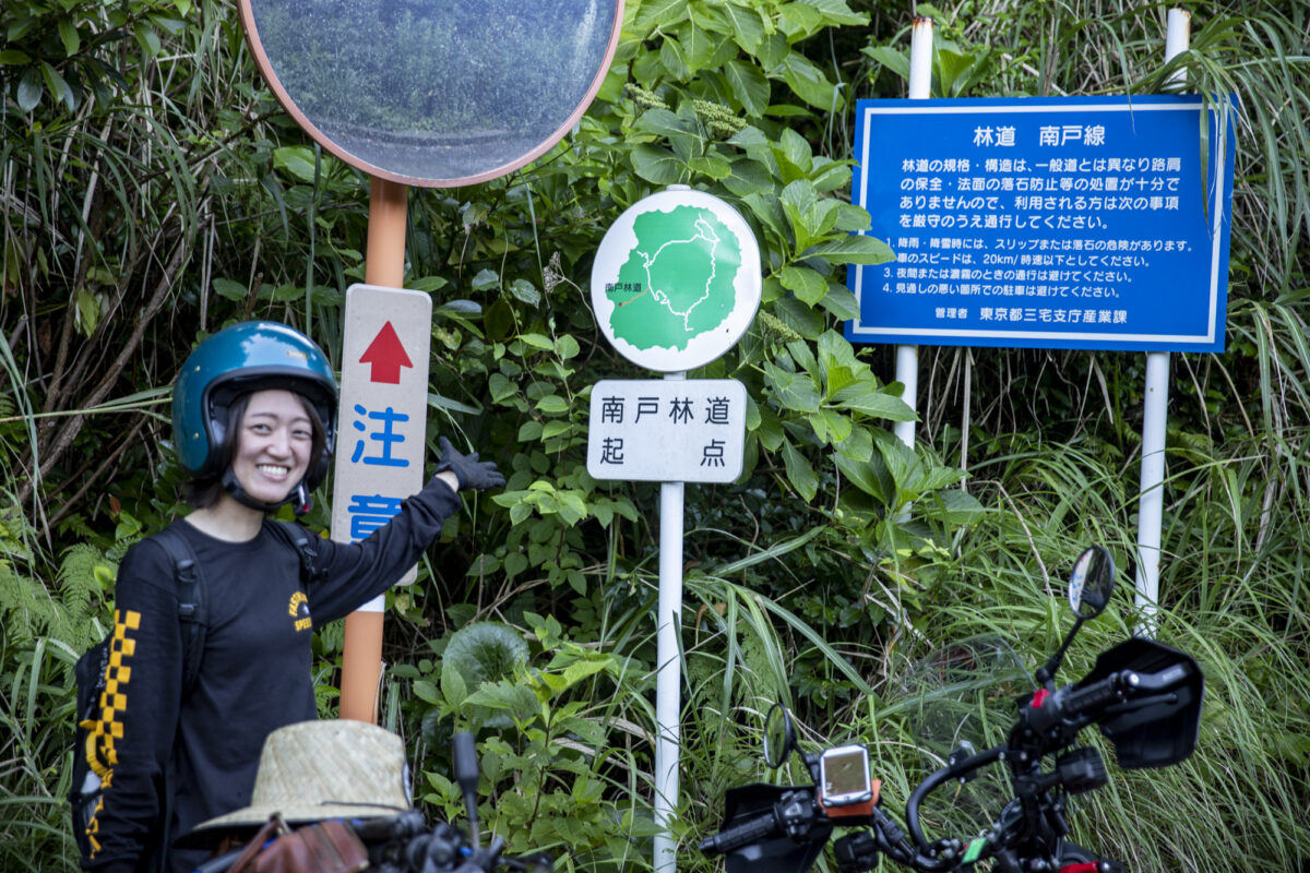 伊澤さんは実はこの日が公道デビュー。島に到着してから少しだけ大きな道を走ってバイクと公道に慣れたら、いざ林道へ。最初はフェリーが着いた錆ヶ浜港のすぐ近くから島の中心へと駆け上がる「南戸林道」です。