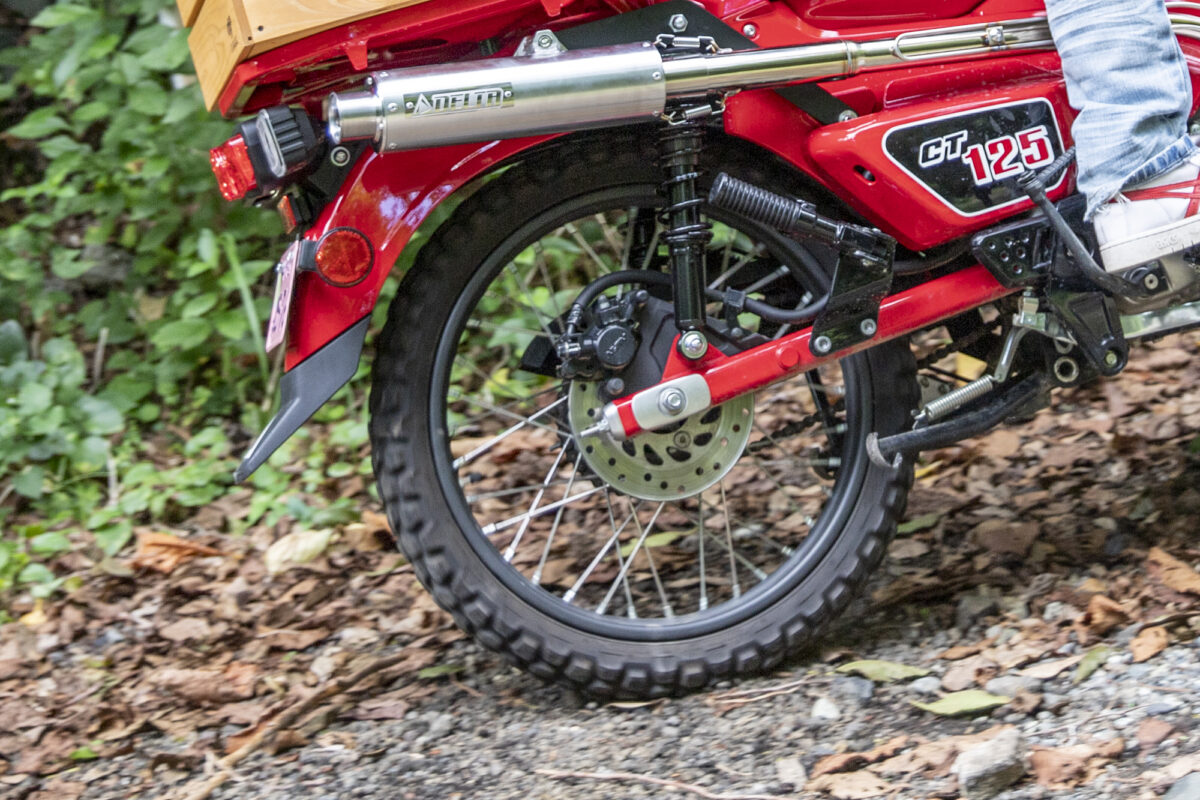 CT125ハンターカブの純正タイヤはもう少しブロックが小さいんですよね。これはダートを走ることを想定し、IRCのGP-21/GP-22というタイヤを装着しています。カブで林道に行くならこのタイヤは本当にオススメですね!