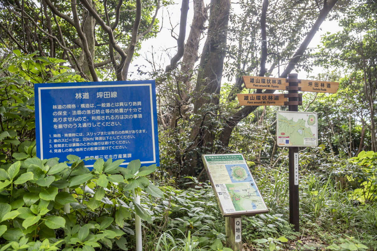気持ちの良い「雄山環状林道」を少し走ると、島の南部にある坪田地区へ降りていく「坪田林道」との交差点へ。