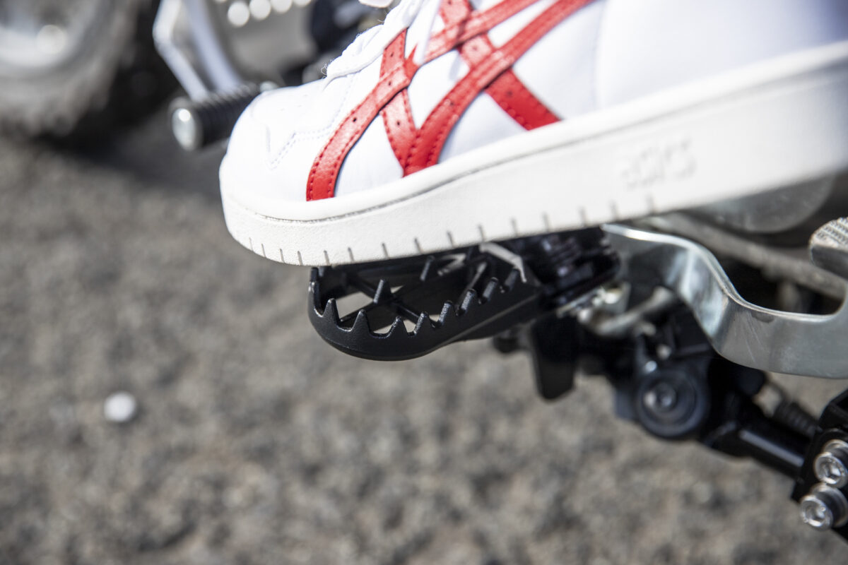 ステップの上面がギザギザしているため、ブーツの裏がステップによく食いつきます。また、ステップの幅も50mmと大きいため、体重を乗せやすい形状です。滑りにくいのはもちろん、荷重コントロールがしやすいので、オフロードだけでなくロードでもアリなアイテムです。ちなみにオフロードでどう良いかというと、泥が詰まりにくいところ。上下に貫通して穴が空いていますので、小石や泥がステップに溜まらないんです。これは本当にありがたい!