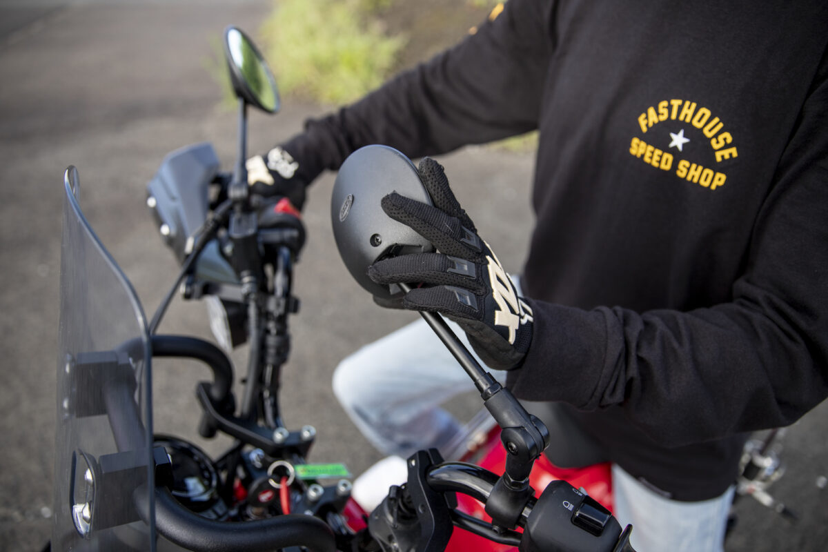 また、スクードプロテクターなどを装着することで細い林道でも木の枝などを防いでくれます。20kmとかでも、細い枝が小指に当たると、信じられないくらい痛いんですよね……。あれを一度経験してしまうと、必須アイテムと言えますね。ちなみにこのスクードプロテクターは上下反転が可能。下側が長いこの状態がスポーツモード。スタンディングで乗っても手に干渉しにくい形状です。また、ひっくり返して上側を延長させると雨や風をしっかり防いでくれる大型のフードに変身します。