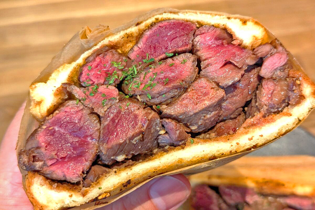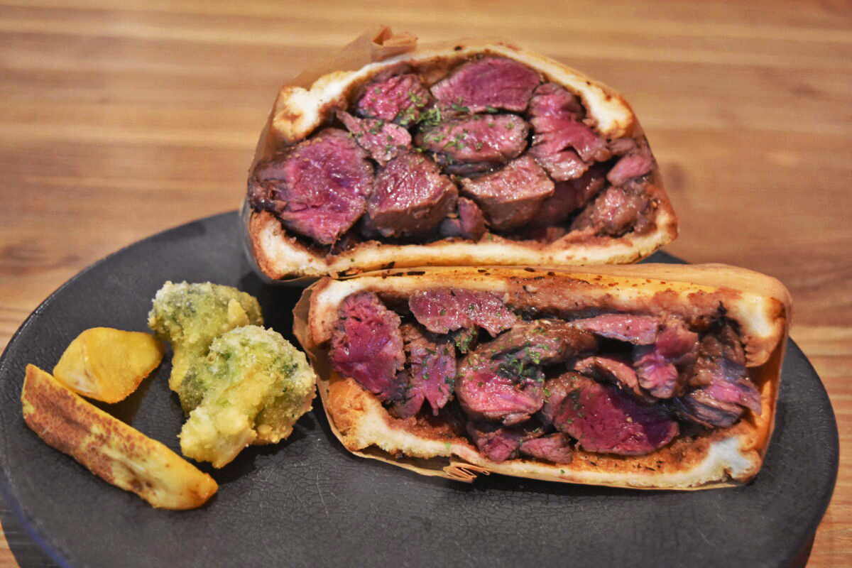お肉をたっぷり食べられるステーキセットや、さまざまなお肉を味わえるランチプレート、ハンバーグやカレーなども評判ですが、肉たっぷりの「ダブルステーキサンド」をいただきました。