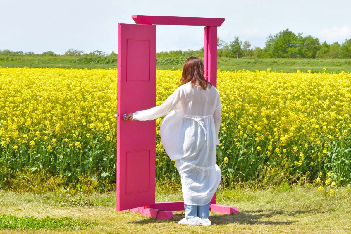 菜の花畑にはピンクの扉が設置され、記念撮影したい人が人気ラーメン店並みに行列を作っていました。某テレビ番組で「どこでもドアのパクリでしょう?」と突っ込まれていましたが、関係者は「ピンクのドアです」と、しらばっくれていました。