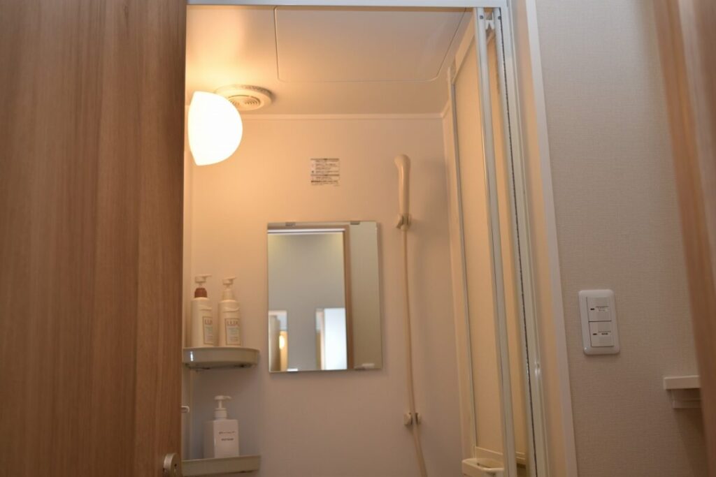 シャワールームは清潔に保たれています。バスタオルのレンタル・ハンドタオル・歯ブラシ・カミソリは各100円です。