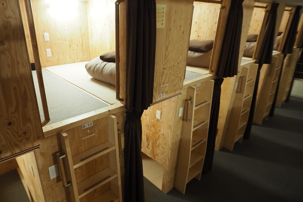 ドミトリースペースは、木のぬくもりを感じる個室タイプで、エコノミー(上段)は、一般的なカプセルホテルの1.5倍、デラックス(下段)は幅153㎝、奥行200㎝、高さ160㎝を誇り、キャリーバッグなどの荷物も収納できます。プライバシーが守られたカプセルベッドは居心地よく、女性の一人旅にもおすすめです。24時間スタッフが常駐しているので安心です。
