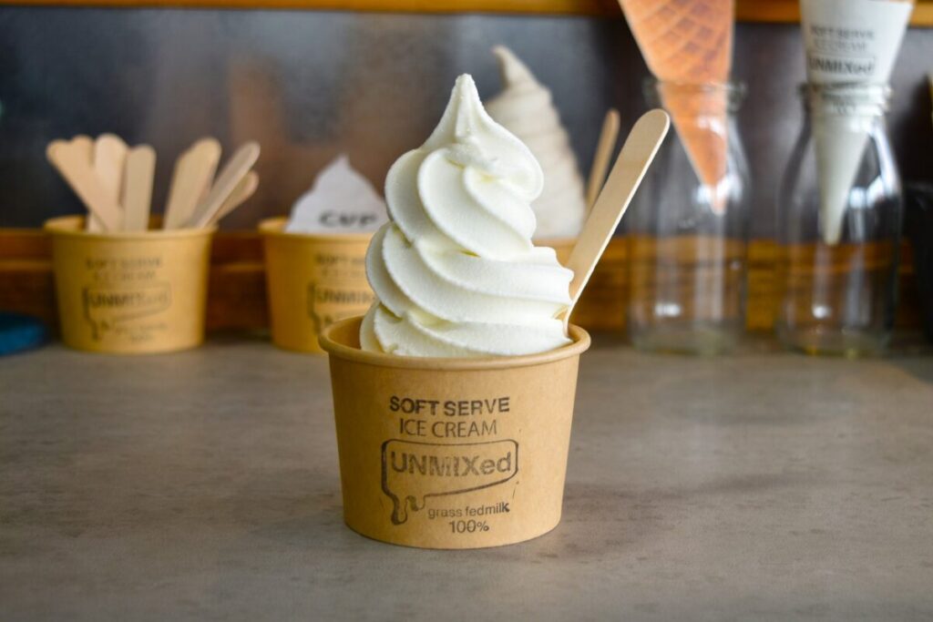 1階のCafé&Bar「UNMIXed SOFTSERVE ICECREAM」では、「無添加ソフトクリーム」を販売。市内にある「のぼりべつ酪農館」で作られた5種類の牧草のグラスフェッドミルクに、水あめとミックスすることで濃厚な旨味を作り上げています。