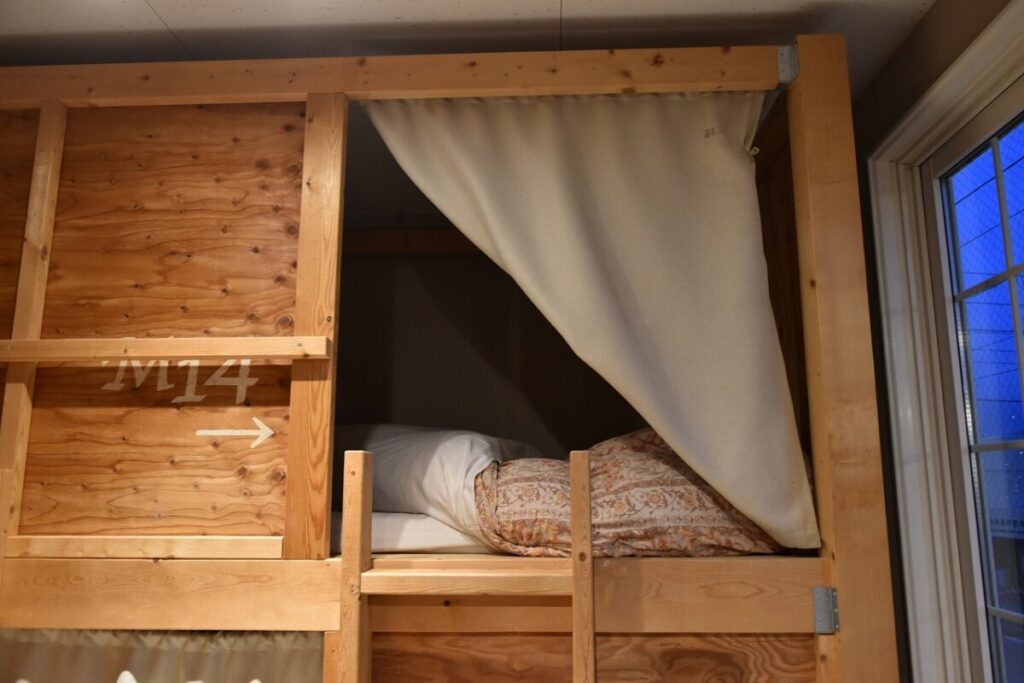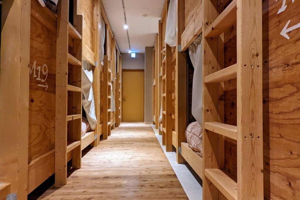 客室は全室ドミトリーで、男女共用(最大22名)、女性専用(最大12名)、プライベートドミトリールーム(最大4名)の3つのタイプを用意。大きめの二段ベッドと日本製の特注羽毛布団で快適に休めます。フロアにはトイレや洗面所も完備。温泉に入りに行く人が多いそうですが、シャワールームもあります。