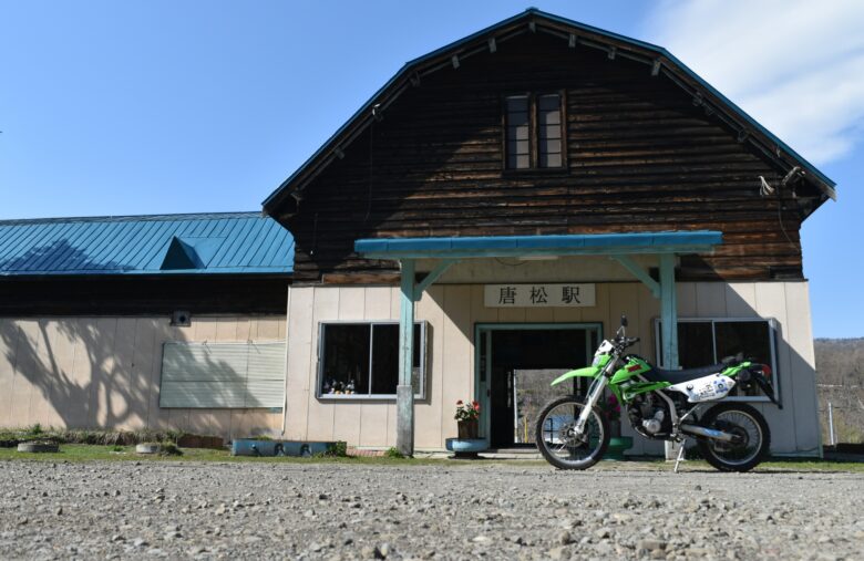 三笠の見どころは大きく二つのエリアに分かれています。まずはクロフォード公園近くの分岐から「桂沢湖方面」に向かいます。「旧唐松駅」は、朽ち果てていく姿に心を痛めた有志らによって修理・復元されました。駅舎はギャンブレルと呼ばれる将棋の駒のような形をした屋根を持つ個性的な建物で、「ツーリングマップル 2017 北海道」の表紙を飾っています。