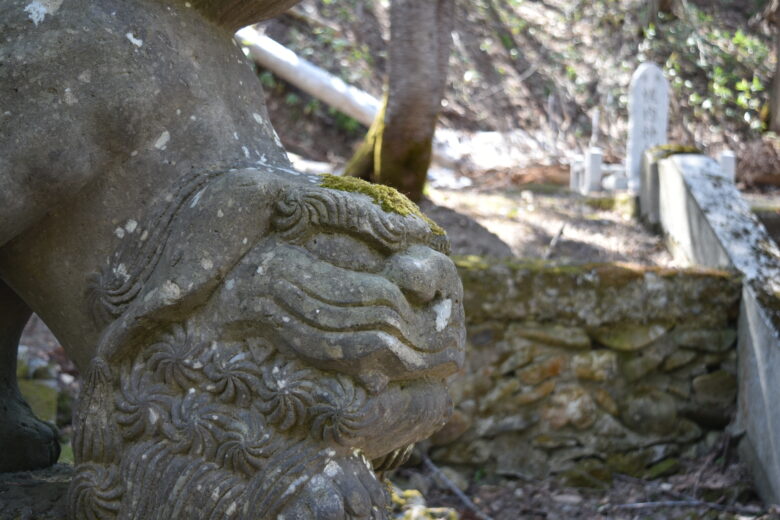 旧変電所の隣に「幌内神社跡」があります。すでに建物などは取り壊され、狛犬が墓標のような石碑を守っています。 石碑は奇跡的に折れた老木の直撃を免れていました。神秘のパワーを感じずにいられません!