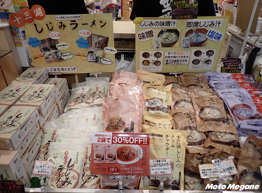 売店には、十三湖産の活しじみや、レトルトのしじみの味噌汁やラーメンなど、しじみを使った商品が並ぶ。珍しいものだと、しじみエキスを配合したしじみドリンクやカプセルなどもある。他にも産直野菜や、地元銘菓をはじめとする土産品も取り揃えられている。売店の一角には、十三湖やヤマトシジミについての展示コーナーもある。