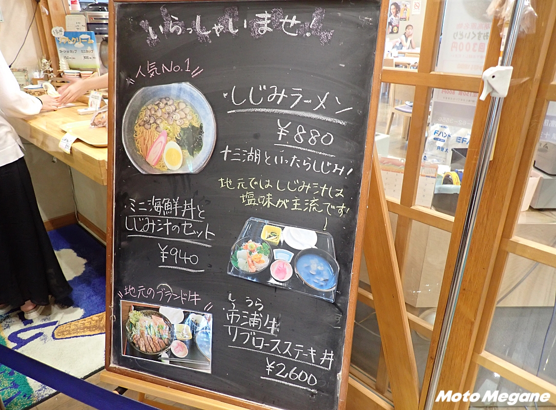 レストランでは、期間限定の「しじみの汁焼きそば」やしじみ汁、しじみスパゲッティなど、十三湖産のしじみを堪能できるメニューが充実。ほかにも、岩のりラーメンや、市浦牛のステーキ丼など地元食材を使ったメニューを味わうことができる。レストラン入口横には、テイクアウトコーナーがあり、こちらでもしじみ汁の注文が可能。しじみカレーが中に入ったカレーパンもオススメだ。