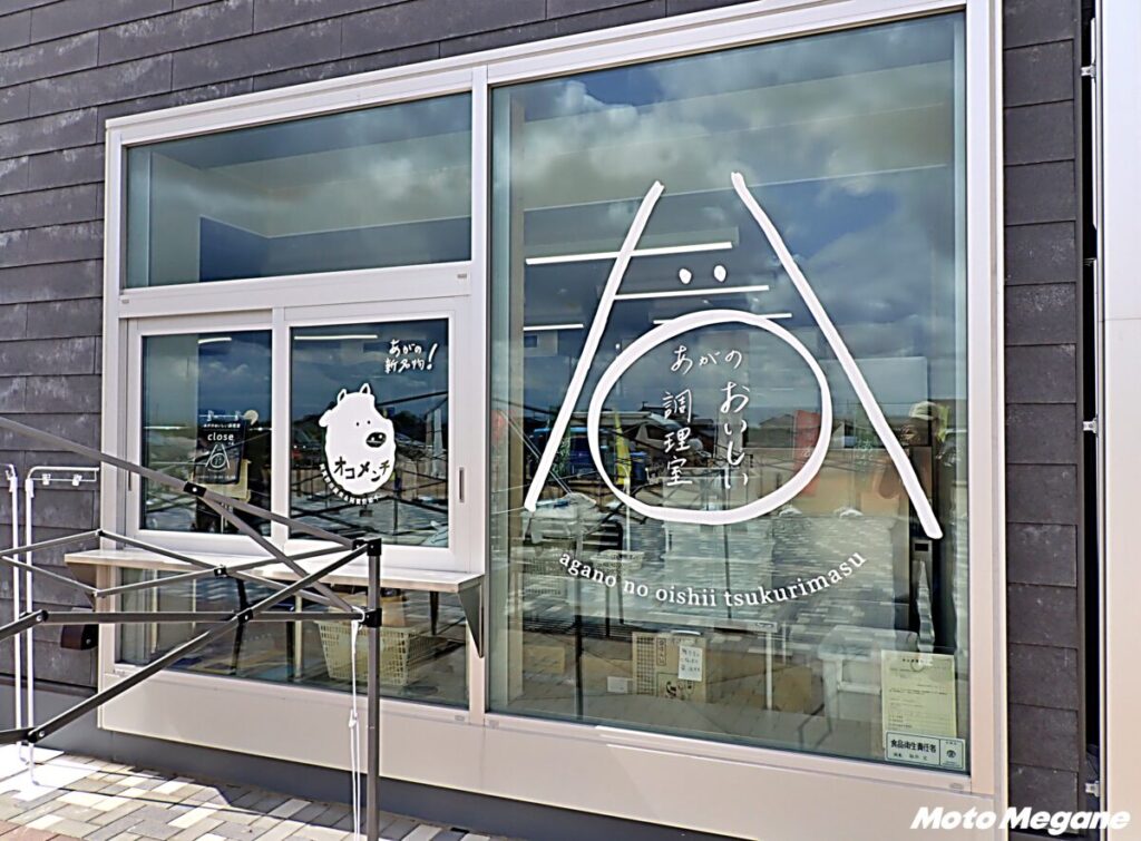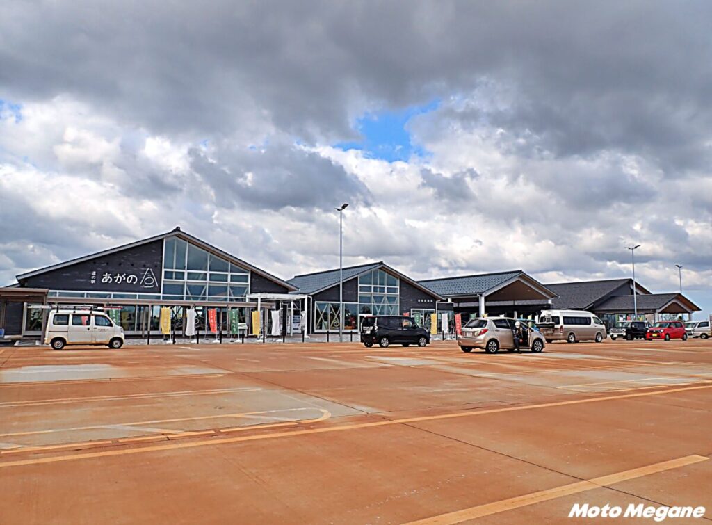 『道の駅あがの』はR49沿い、新潟市中心部から約20分の場所にある。2022年10月6日にグランドオープンした県内42番目となる新しい道の駅だ。周辺は、遠くには五頭山を望む、のどかな田園地帯となっている。駐車場は広く、情報提供・休憩施設脇にはバイク用の駐車スペースが用意されている。