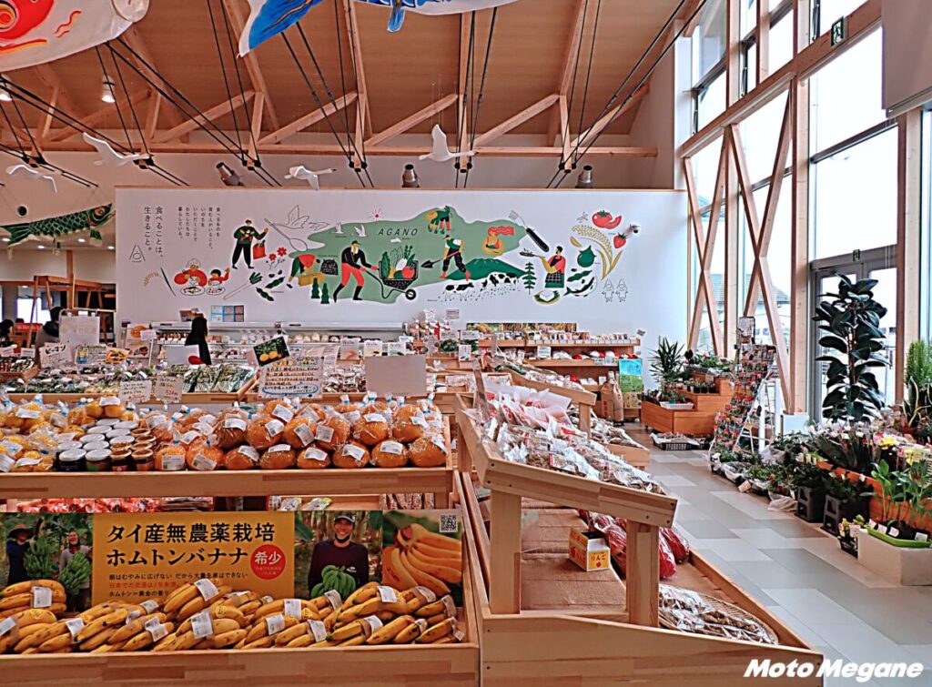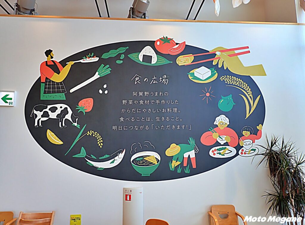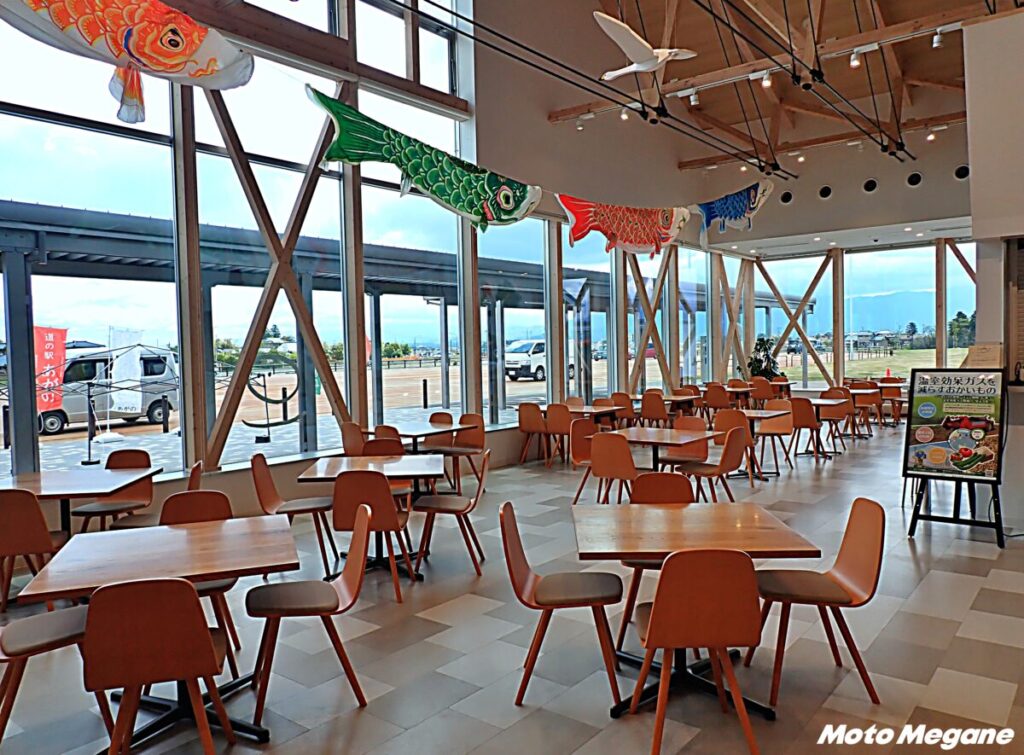 施設内は産直・物販エリア、飲食エリア、カフェ、プレイルームに分かれている。大きなガラス窓からは光が差し込み、明るく、木のぬくもりがある店内だ。壁には阿賀野市の特産品などのイラストが描かれ、阿賀野のことを一目で知ることができる。