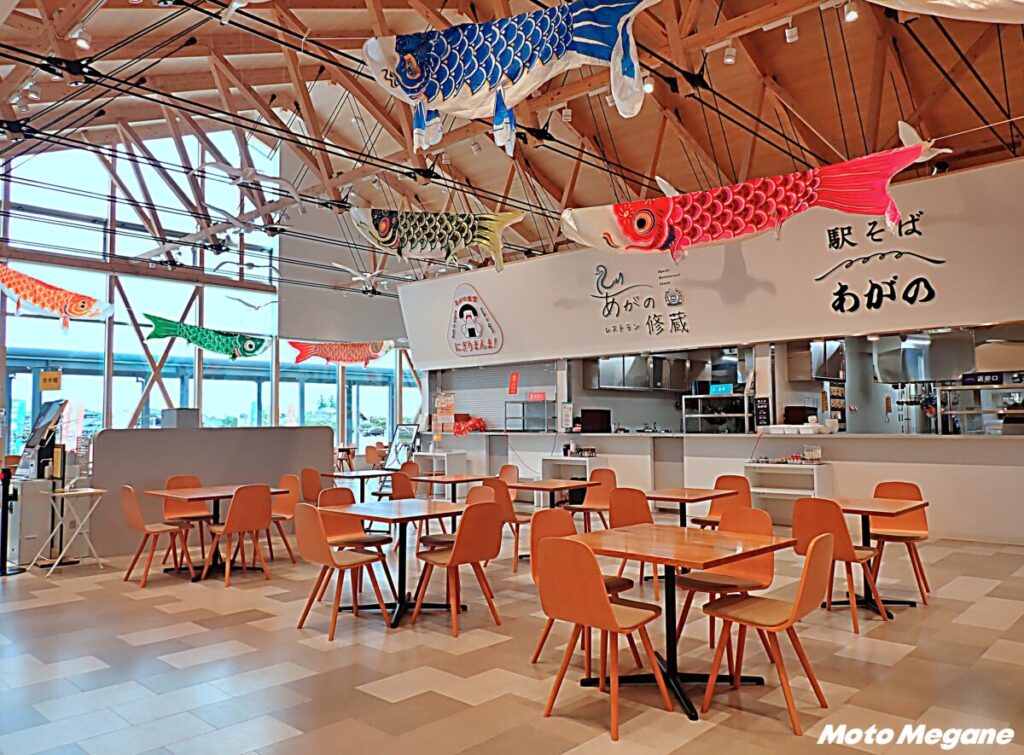 飲食エリアはフードコートとなっており、3店舗が営業。どの店舗も阿賀野の食材を使用した料理を提供する。「駅そば あがの」では、そば・うどん、ラーメン、「あがのレストラン修蔵」では、ピザやパスタ、ハンバーグなど、「あがの食堂 握りまんま」では地元産コシヒカリのおにぎり定食を食べられる。