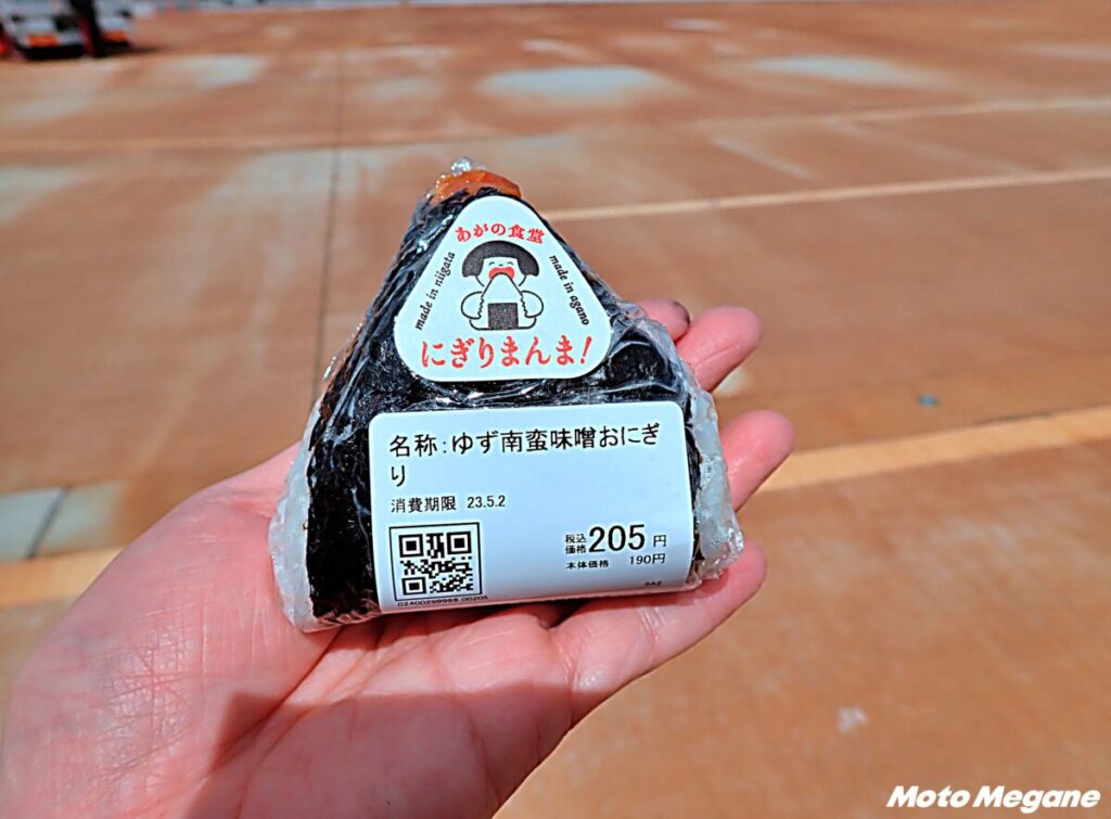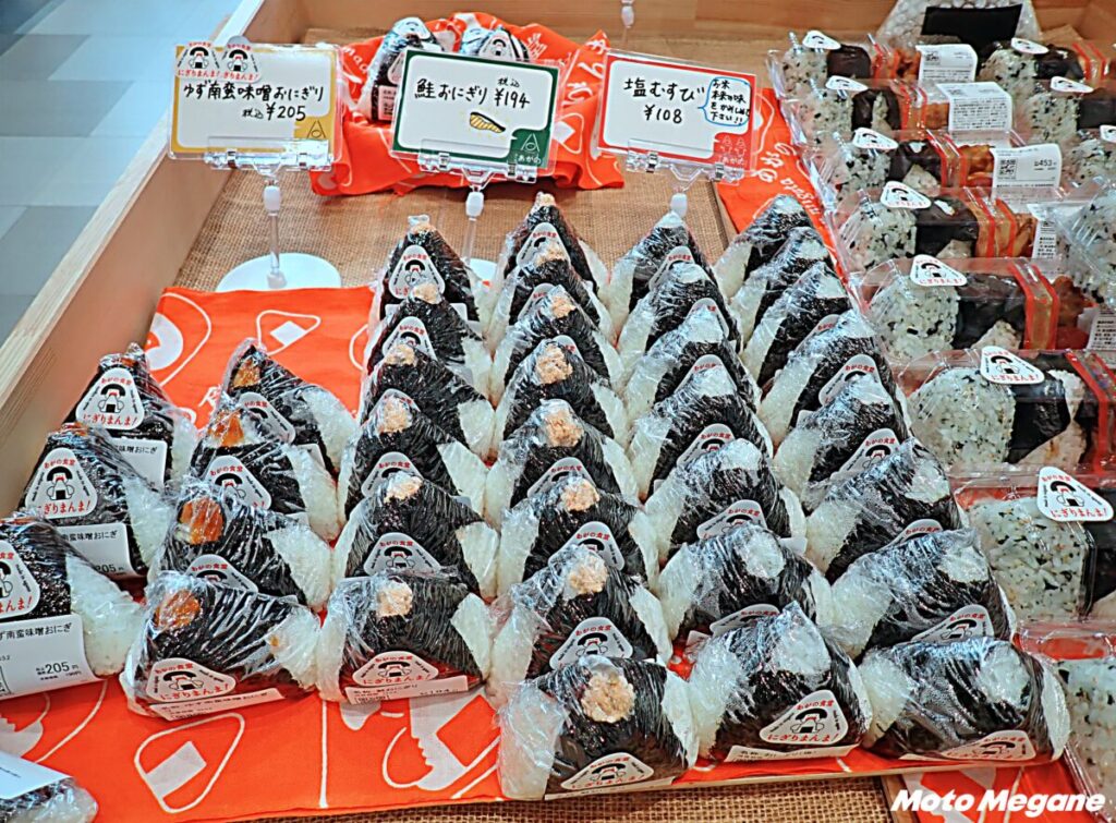 阿賀野市産コシヒカリを使用したおにぎり。塩、梅干、鮭、ツナマヨネーズ、南蛮味噌など具材豊富で、化学調味料不使用で握られる。朝9時からは直売所で、おにぎりやおにぎり弁当を販売する。売り切れ必至の人気のおにぎりだ。