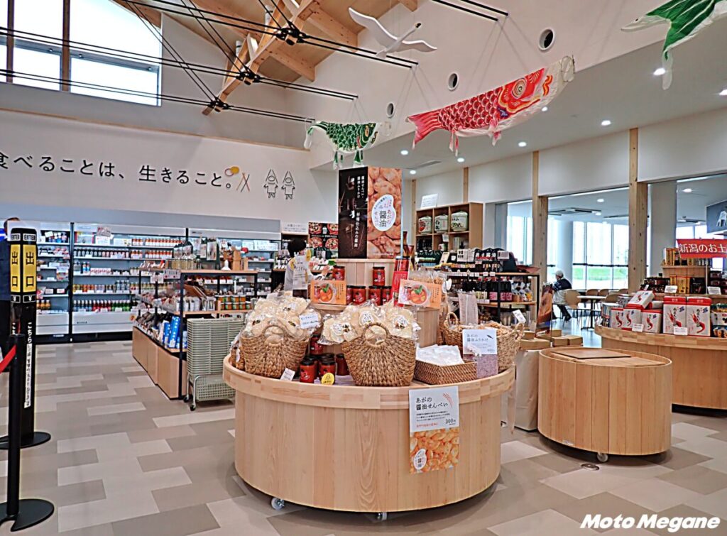 産直・物販エリアには、地元産の農産物や加工品が並び、特に阿賀野市の地場産品が充実。銘菓や醤油、地酒など、阿賀野市で作られている商品がずらりと並ぶ。道の駅オリジナル商品も多彩な品揃えだ。