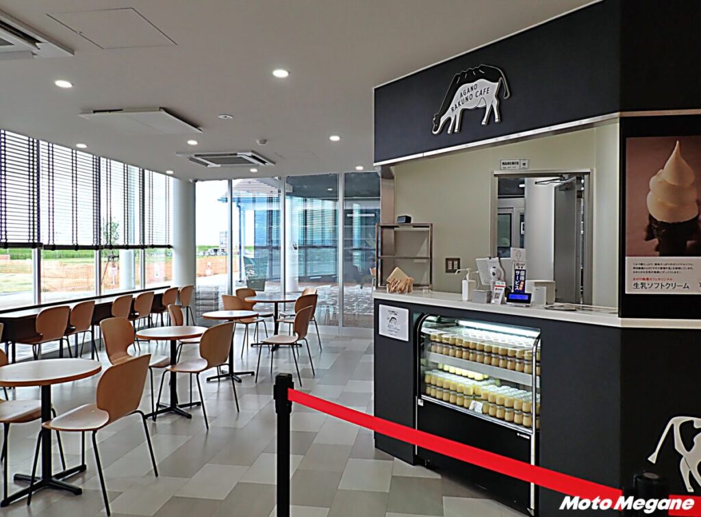 カフェでは、地元産の生乳を使ったソフトクリームやプリン、カフェラテなどを味わえる。地元企業「ヤスダヨーグルト」のソフトクリームもあり、食べ比べも可能だ。