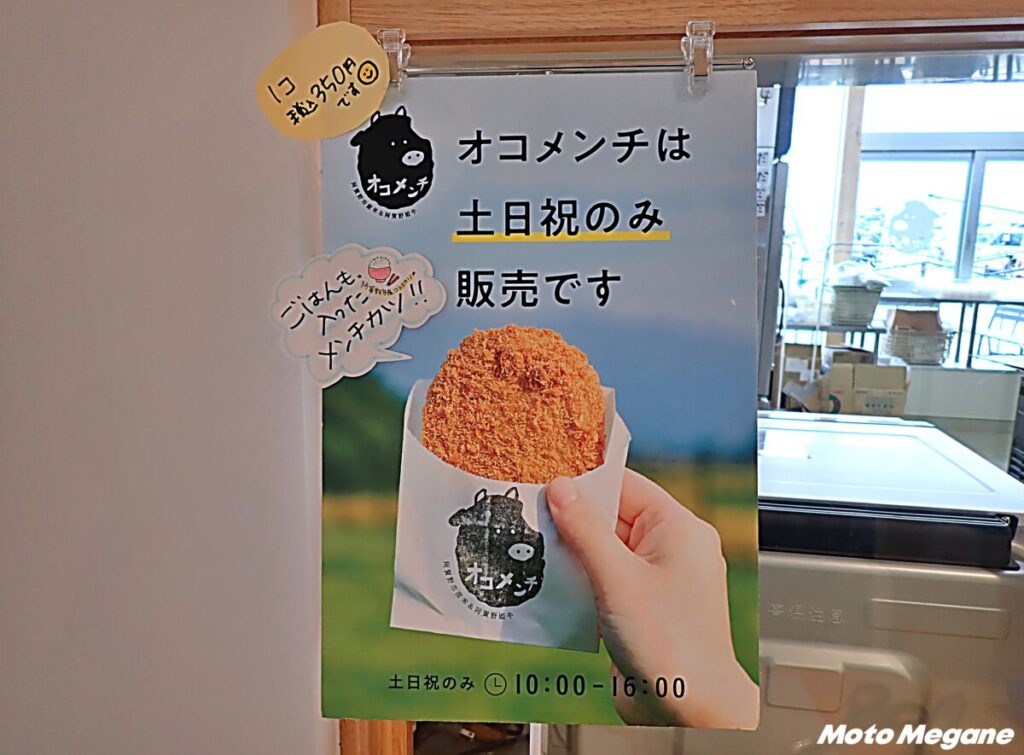 阿賀野市産コシヒカリのご飯が入った新名物のオコメンチ。あがの姫牛、国産豚肉、お米を使ったメンチカツで人気の一品。土日祝日のみ「おいしい調理室」で販売する。衣はサクサク、中身はもっちり、揚げたてをぜひ。