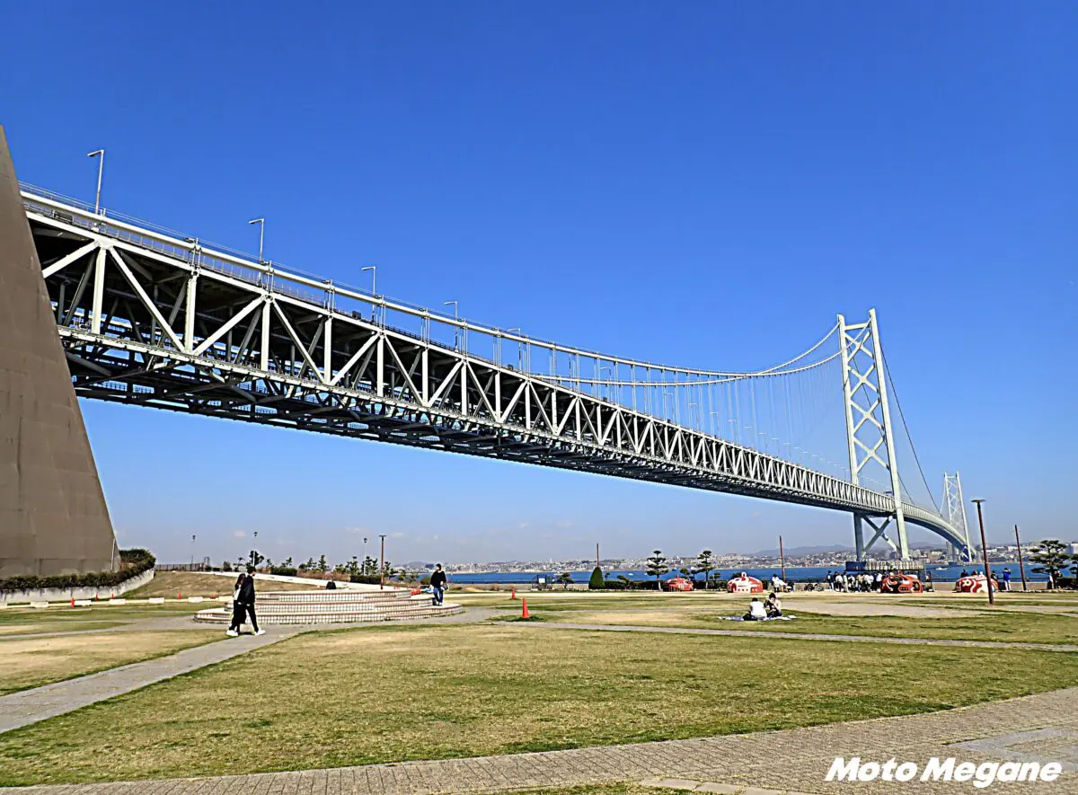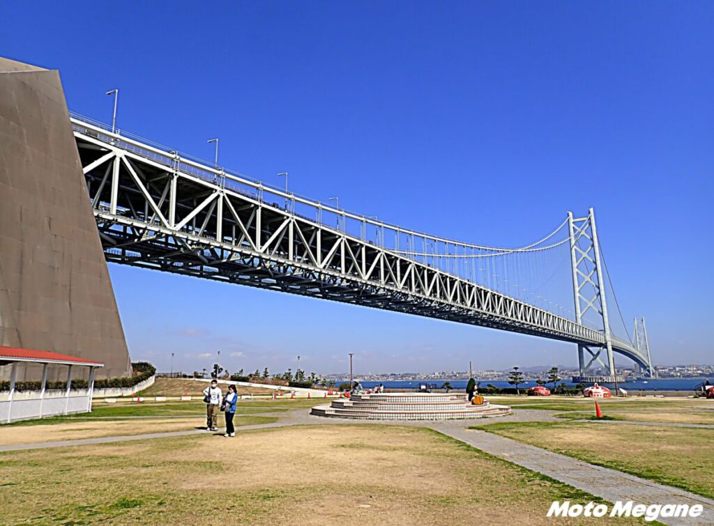 神戸市と淡路島を繋ぐ、全長3911mの世界最長の吊り橋。パールブリッジという愛称がつけられ、夜にはライトアップされて幻想的な雰囲気となる。海面からは約300mのところにあり、東京タワーとほぼ同じ高さ。道の駅裏手の広場からは巨大なアンカレイジや、真下からの大橋の眺めを楽しめる。
