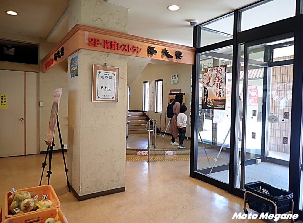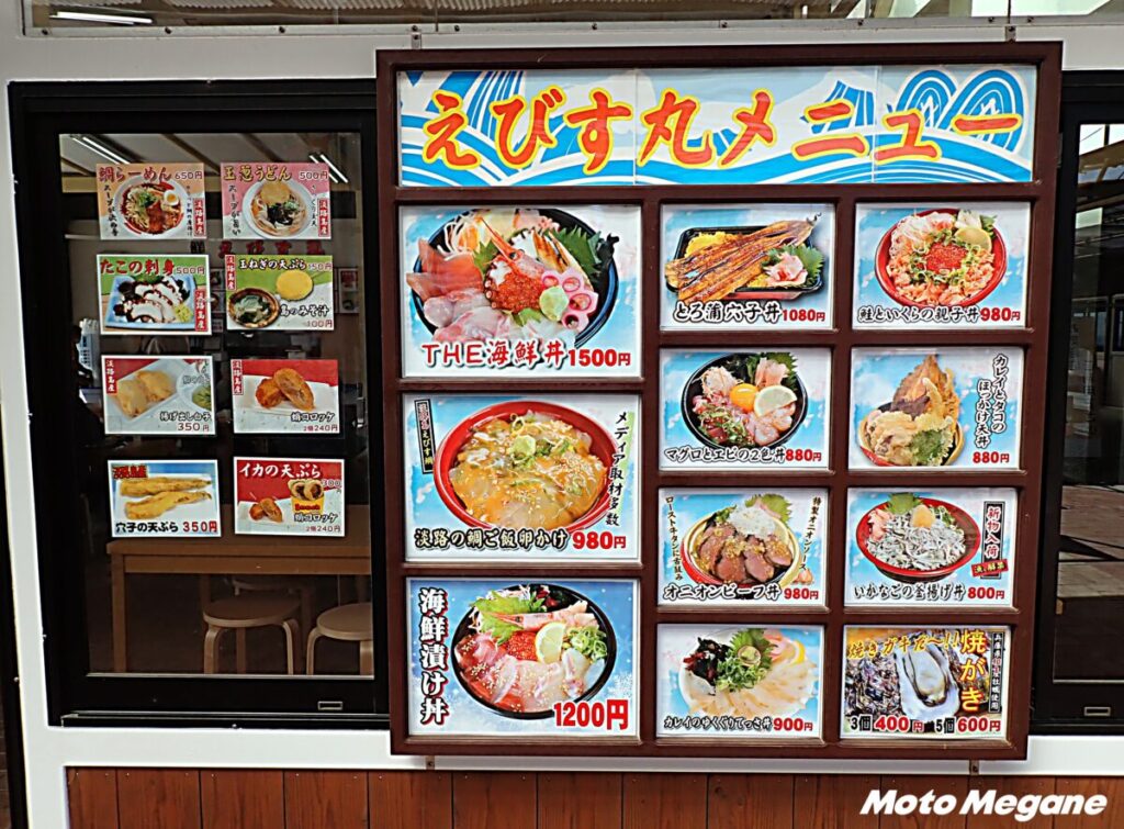 建物2階にあるレストランでは、淡路島の食材を使った料理を提供。海鮮のほか、淡路牛のステーキ丼や炙り丼、すき焼き重なども味わえる。レストランのイチオシは海鮮と淡路牛がどちらものった「淡路牛炙りと海鮮よくばり丼」。テラス席は、明石海峡大橋を一望する展望席となっている。1階には地元民にも大人気の大衆食堂があり、麺類やカレー、定食や丼ものをリーズナブルな価格で食べられる。