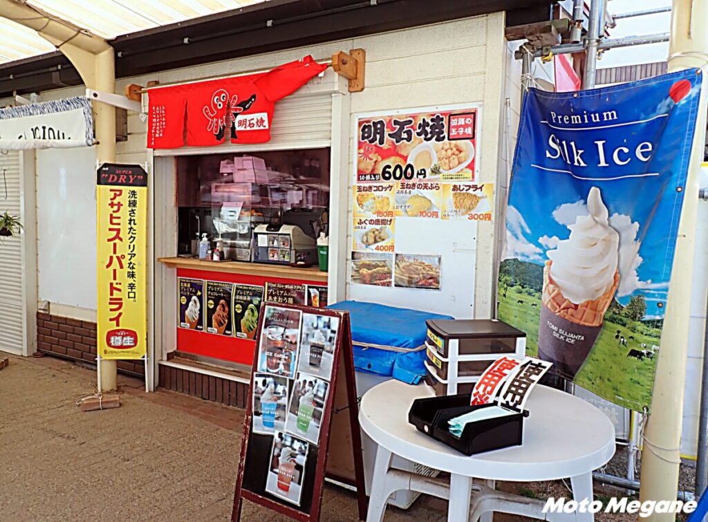 ほかにも、バーガーショップでは淡路牛を使ったオリジナルバーガー、土日祝日のお昼時限定で焼き穴子丼、タコや玉ねぎ、島のりを使った揚げたてのかまぼこを販売する「練物屋」、淡路島マフィンと焼き立てパンを販売するベーカリー、明石焼き店など、多彩なジャンルの飲食店が揃っている。建物裏手にはテーブルとイスが数多く用意されており、明石海峡を眺めながら購入したものを食べられる。