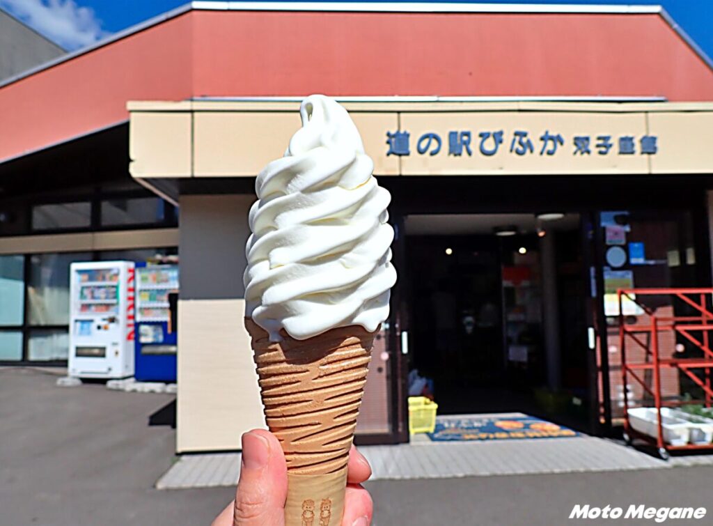 美深町産の搾りたて牛乳を使った濃厚ミルク味のソフトクリーム。メープル味のコーンがミルクとの相性抜群!コーンのサクサクとした食感も◎ 道の駅限定のソフトクリーム。