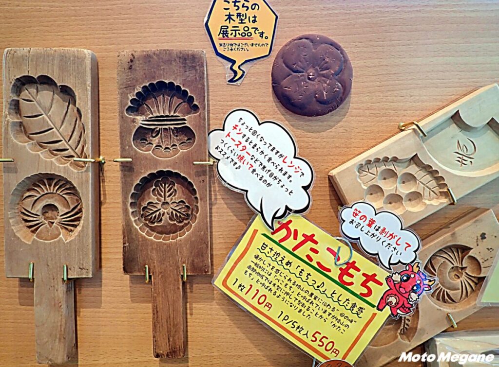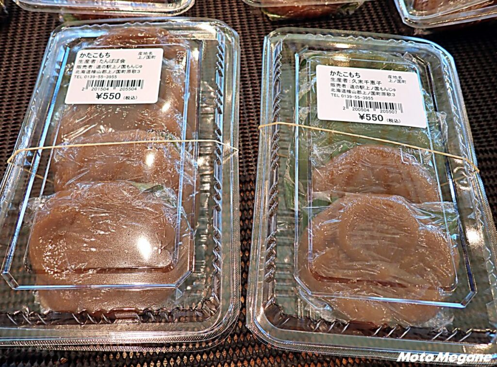 北海道南地域の郷土菓子。煮詰めた砂糖に米粉を加えながら練り、木型に押して型を取ってから蒸したもの。モチモチとした食感の素朴な味わいの菓子。一般的には「べこもち」と呼ばれるが、檜山南部エリアでは木型に押して作ることから「かたこもち」と呼んでいる。