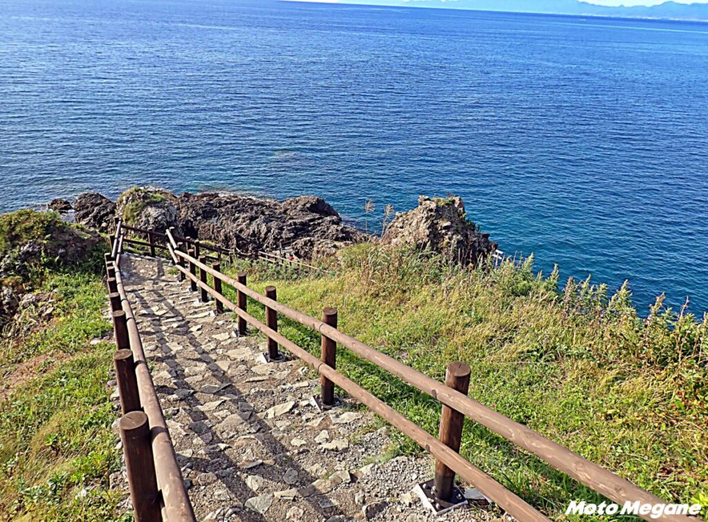 散策路を歩いていくと崖下へと続く階段があり、海面近くまで降りることができる。崖下では、龍灯伝説が残る「神の道」を見ることもできる。