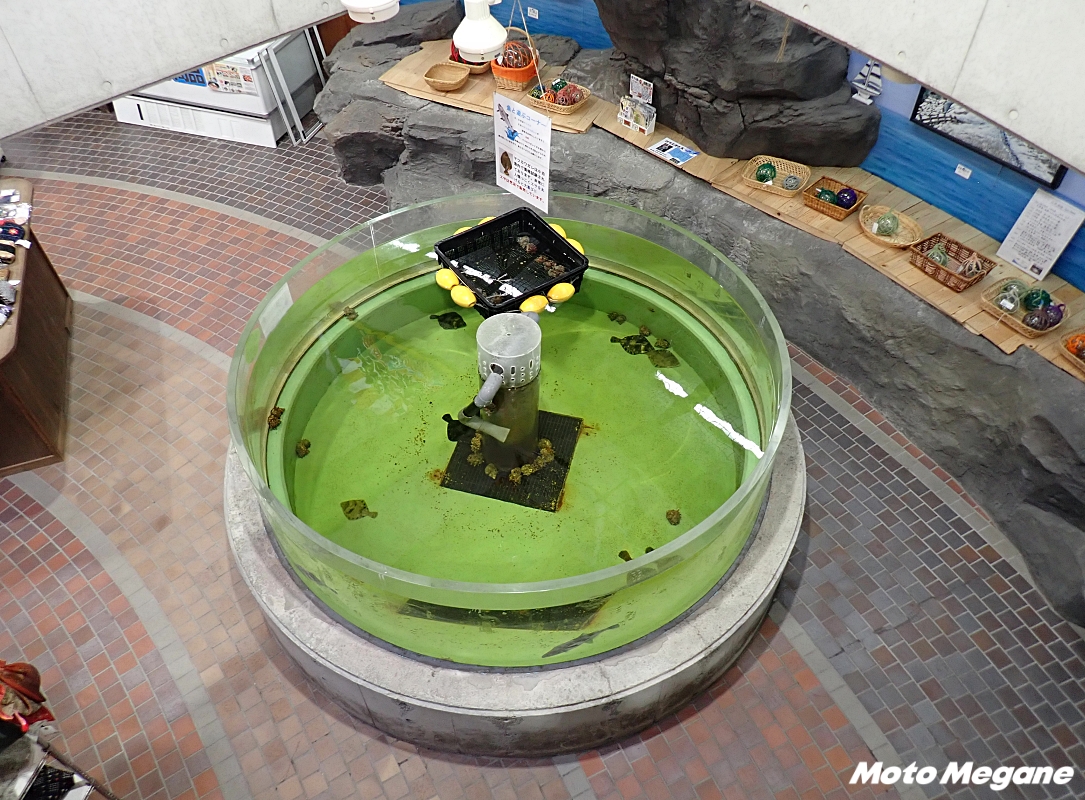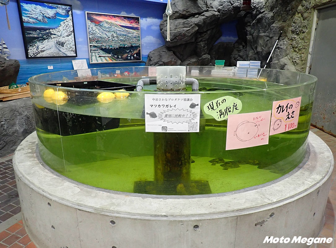 物産販売所には小泊の地場産品や津軽地方の土産品などが並んでおり、中でも特産のメバルやヤリイカの商品が数多く並ぶ。物産販売所を奥に進むと水槽が設置されており、マツカワカレイやヤリイカなどその時々の魚が養殖されている。レジで販売されているエサをあげることができるのだが、満腹の時は食べてもらえないこともあるようなので、水槽に張り出されている満腹度指数を先にチェックするといいだろう。