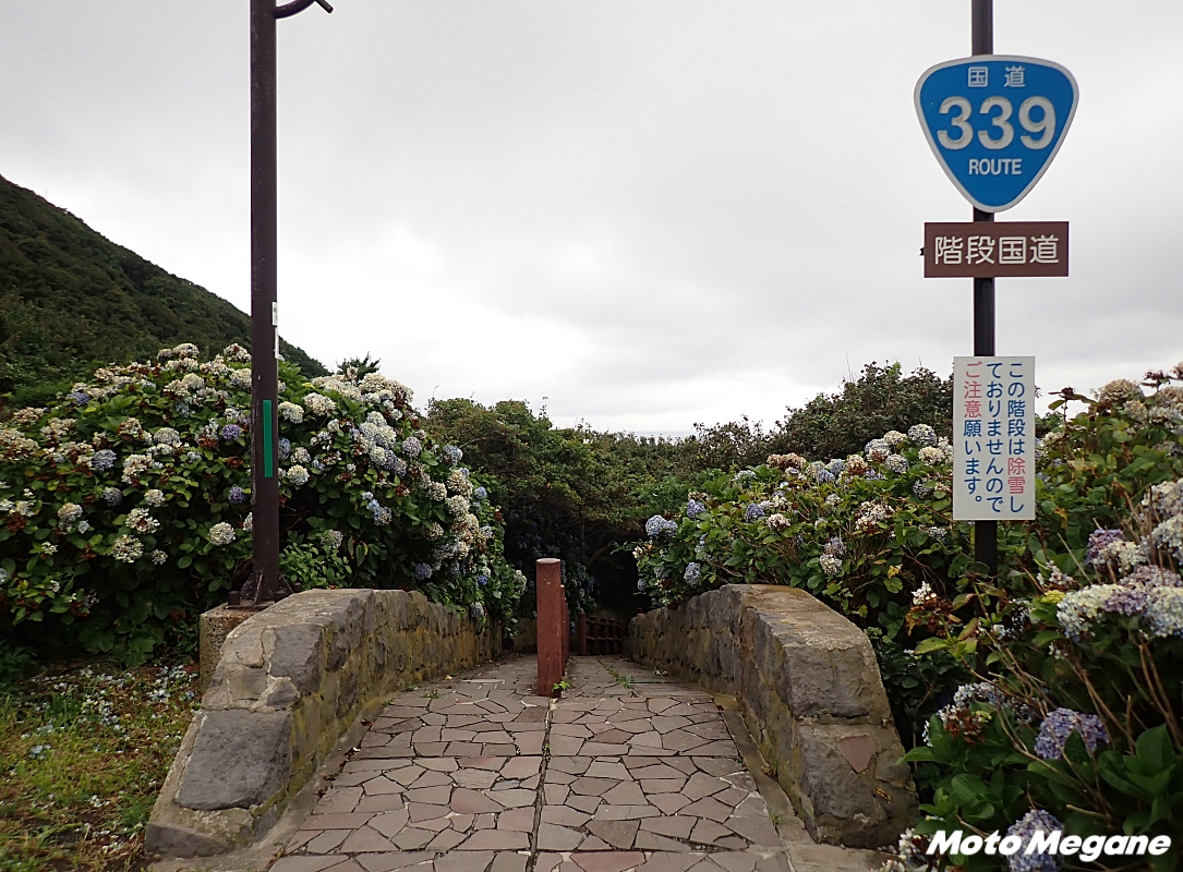龍飛岬を通るR339は日本で唯一の「階段国道」がある珍しい国道だ。車もバイクも通れず、歩行者のみ通れる国道で、龍飛埼灯台の下から龍飛漁港まで362段の階段になっている。走破する場合は、岬上か岬下にある駐車場にバイクを止めて歩くのだが、標高差約70mもあり、なかなかハードだ。階段の両脇にはアジサイが植えられており、アジサイのシーズンには見事な景色が見られる。