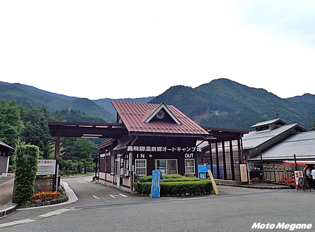 併設の「奥飛騨温泉郷オートキャンプ場」では大自然の中でのキャンプを満喫できる。目の前には渓流釣りのスポットとして知られる高原川が流れるロケーションで、夜には満天の星空を眺められる。サイトは3つのエリアがあり、全て区画分けがされている。全エリアで乗り入れが可能で、バイクは林間サイトか、川に面したサイトのいずれかを利用。温水完備の炊事場、キャンパー専用の無料露天風呂、個別シャワー(有料)、コインランドリーを完備。炭や薪を販売する売店もあるので便利だ。