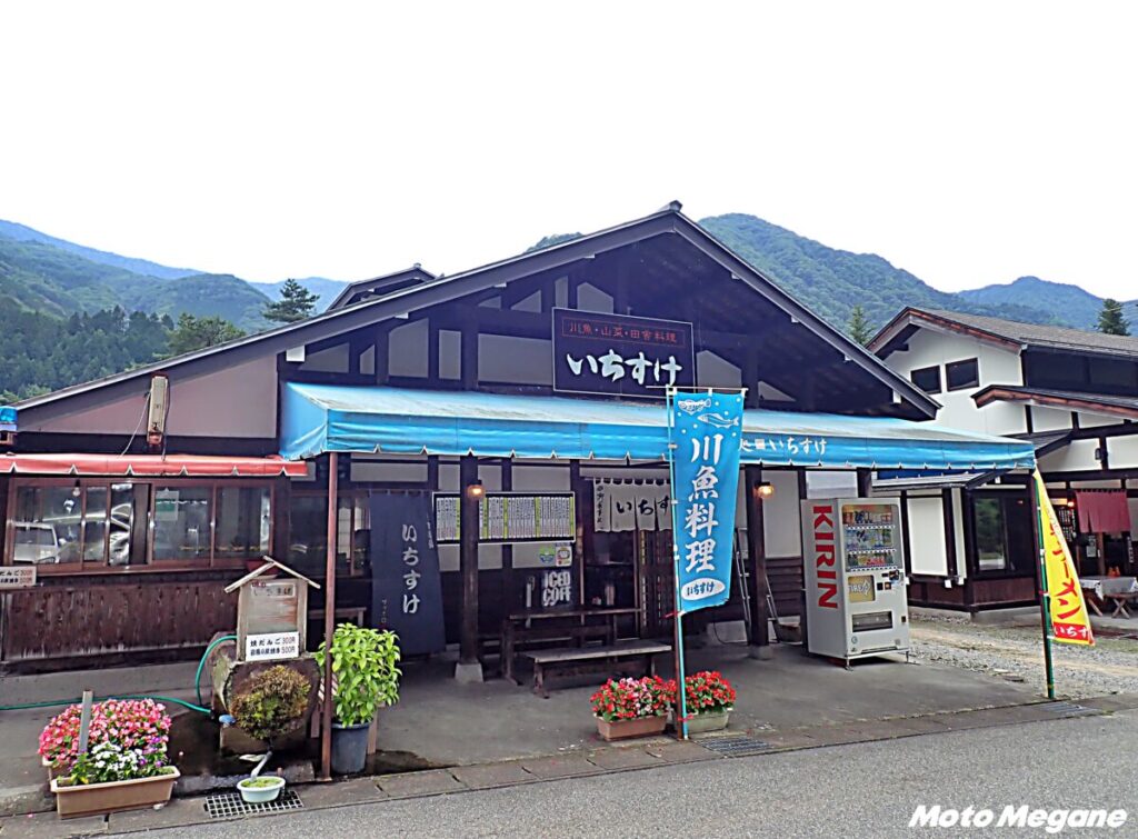 食事処はイワナ料理が食べられる「いちすけ」、飛騨牛や奥飛騨シャモ料理を味わえる「たぬき」の2店舗が営業する。イワナは、塩焼きや南蛮漬け、刺身や天ぷらなど、いろいろな調理法で楽しむことができる。