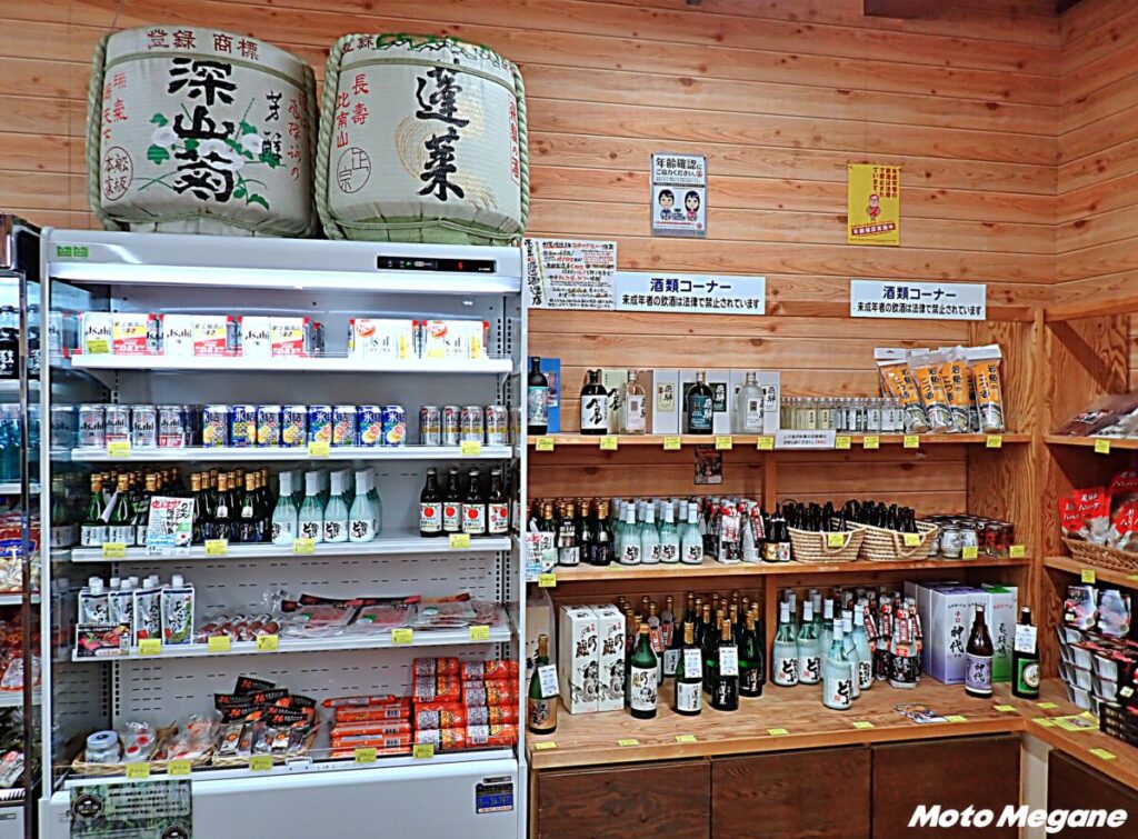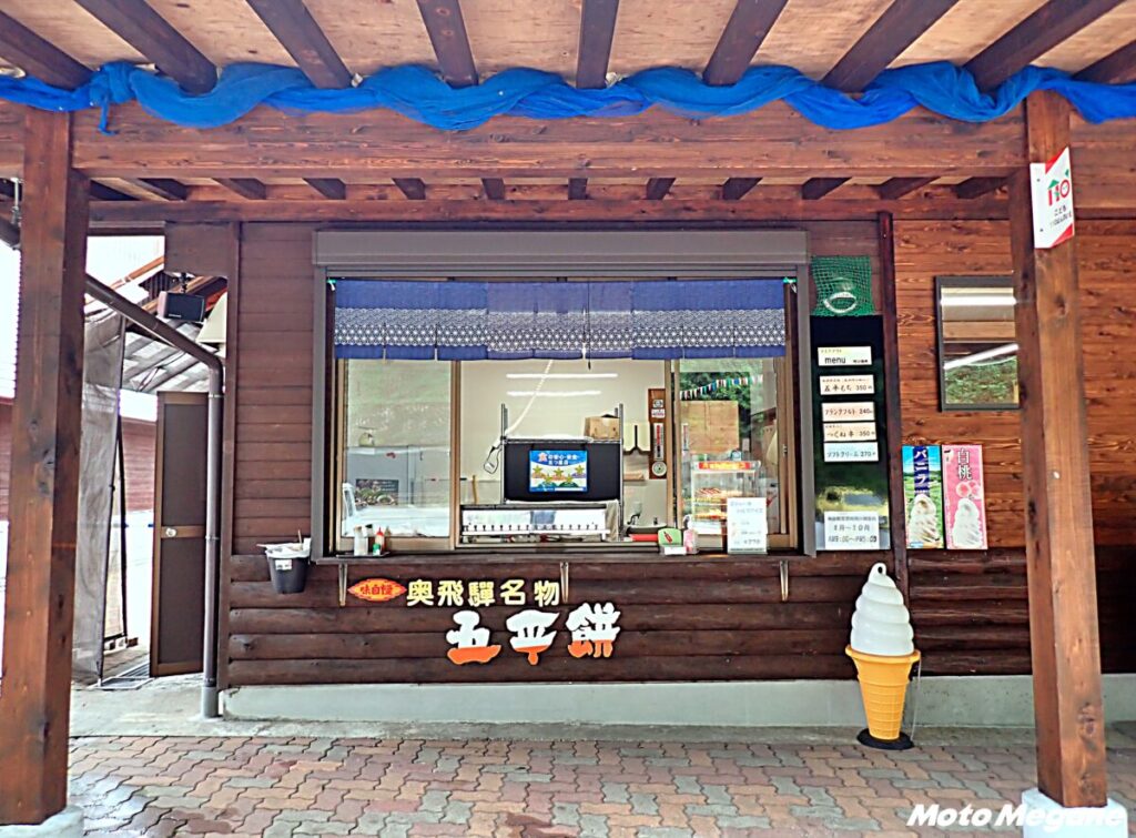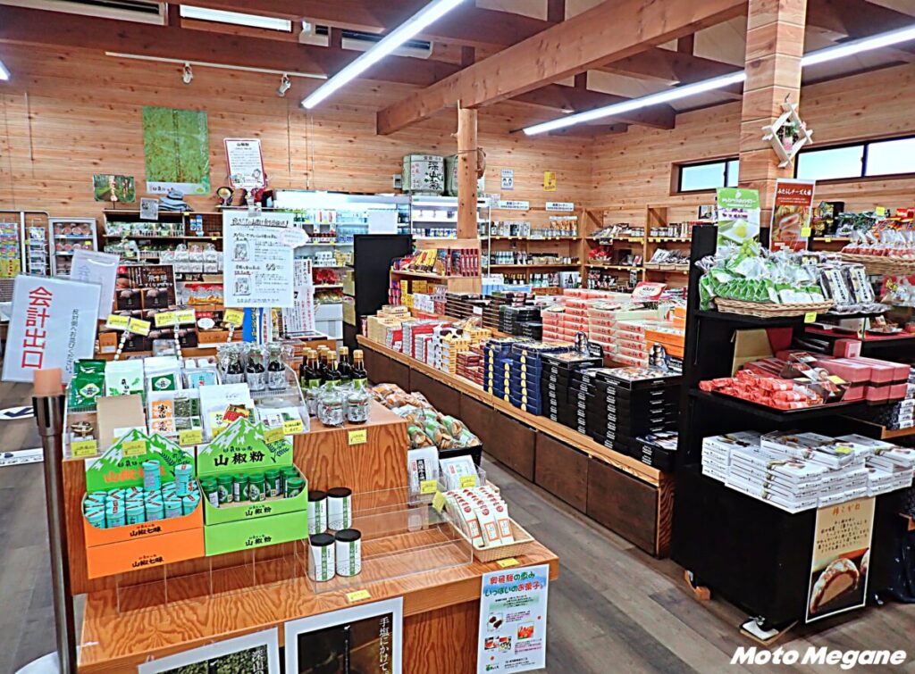 物産館では地場特産品や地酒、土産品を販売。夏季は農産物の直売も行う。特産品では、飛騨山椒や本ワサビ、エゴマ商品、朴葉味噌、赤かぶら漬けなどの漬物が並ぶ。物産館の外では、名物の五平餅を販売。自家製味噌に山椒を加えたオリジナルの味噌を使用しており、甘めの味噌と山椒の香りが相性抜群だ。