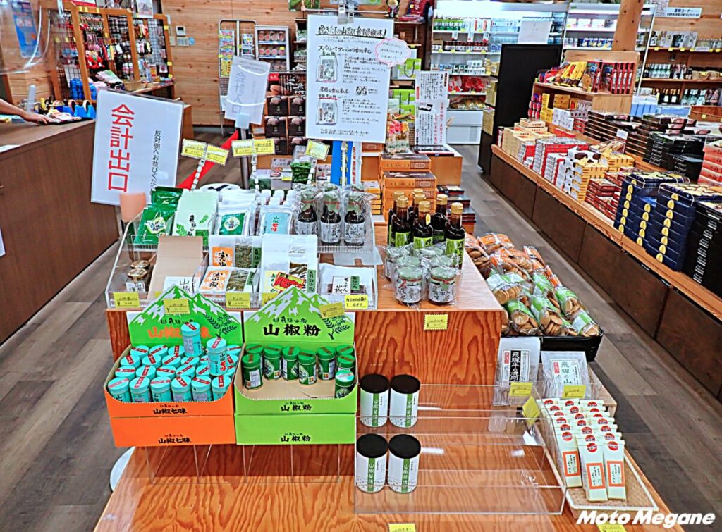 飛騨山椒に使われるのは、奥飛騨温泉郷でしか育たない「高原山椒」で、香り・辛さ・しびれのバランスが絶妙。他の山椒に比べ、柑橘系の上品な香りが強く、鼻に抜けるさわやかな風味が抜群。程よい辛さとしびれもあり、料理の味を引き立ててくれる。道の駅では山椒入りの味噌や醤油、塩、山椒の実など多彩な商品を販売する。