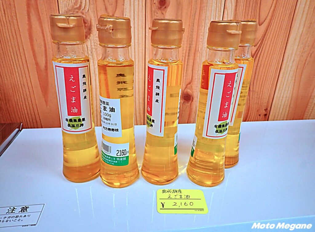 えごまは飛騨地方で「あぶらえ」と呼ばれ、祭りなどの伝統行事の際にはえごまを使った料理が食べられてきた。エゴマは必須脂肪酸のα-リノレン酸や抗炎症作用成分を持つルテオリンが豊富に含まれており、スーパーフードとして注目されている。道の駅ではえごま油やパウダー、ドレッシング、クッキーなどを販売する。