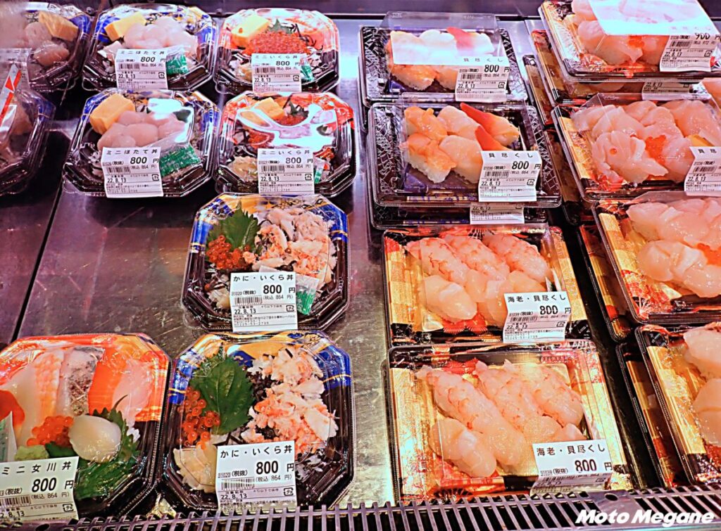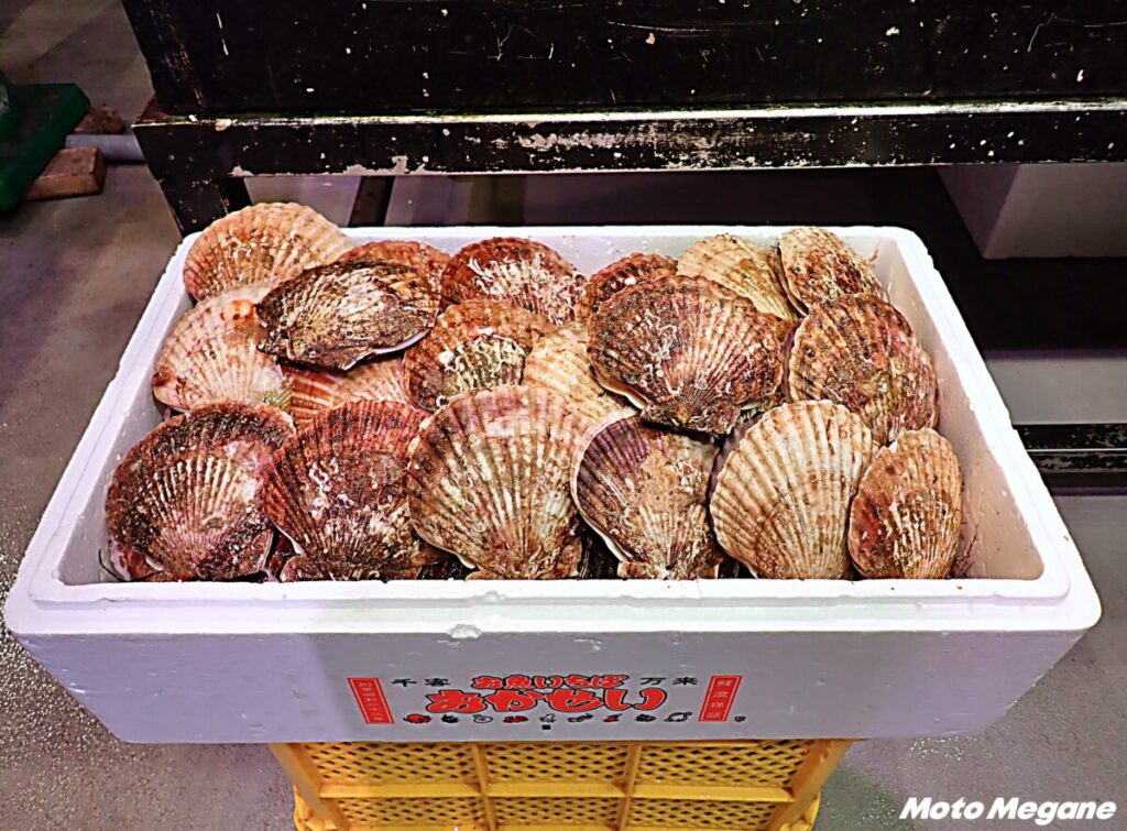 女川の帆立は甘みが強く、貝柱が大きくて肉厚なのが特徴。 夏と冬の2回旬があり、特に夏のホタテは貝柱が大きく甘みが強くなるという。道の駅では生ホタテの販売や、ホタテの握り、丼、浜焼きなどを味わえる。