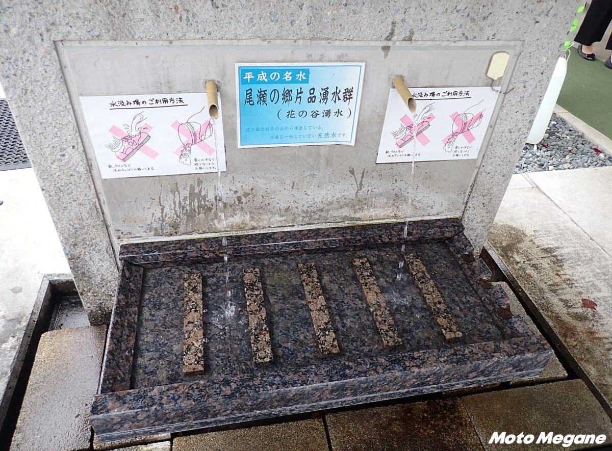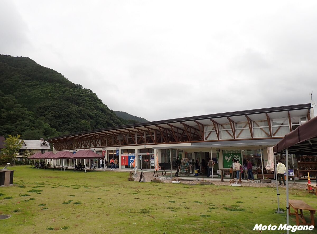 『道の駅 尾瀬かたしな』はR20沿いに位置。バイク専用駐車場も用意されている。地元の新鮮野菜や特産品が販売される農産物直売所があり、食事は名物の「尾瀬名水うどん」や地産地消のメニューを味わえる「かたしな食堂」、定期的に店が変わる「村民キッチン」、地場食材を使用したご当地ソフトクリームや軽食を販売する「スナックコーナー」で食べられる。尾瀬の山々や里山風景が望める展望テラス、源泉かけ流しの温泉足湯、名水百選の湧水を汲める水汲み場もあり、買い物や休憩に最適なスポットだ。