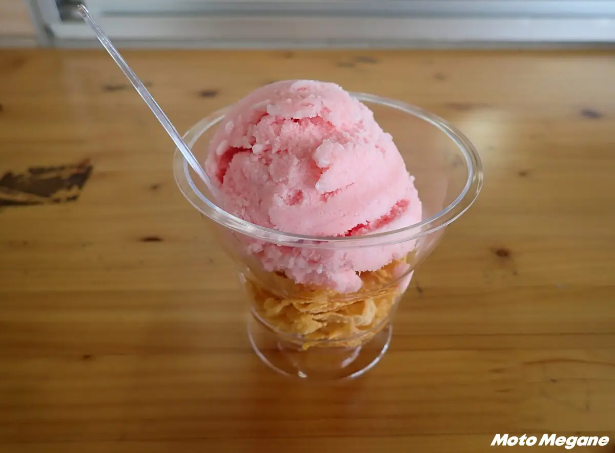 『道の駅 すいかの里うえき』で味わえるのが、スイカの果肉を丸ごと使ったスイカジェラート。一口食べるとまさにスイカそのもの!スイカの甘みと、シャリシャリとした食感は暑い日にぴったりだ。冷たく、さっぱりとした味わいのジェラートが、炎天下のツーリングで火照った身体を冷やしてくれる。ツーリング時に丸ごと1個のスイカはなかなか買えないが、ジェラートで気軽にスイカを満喫できるのは嬉しい。植木産スイカのおいしさを堪能できる一品だ。