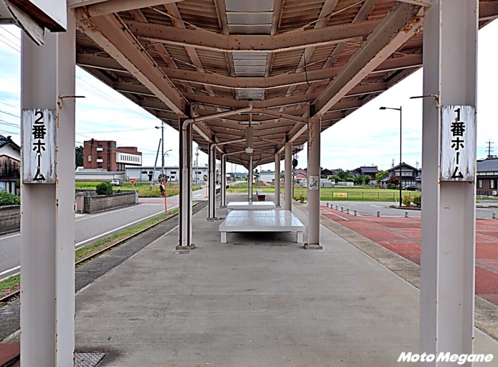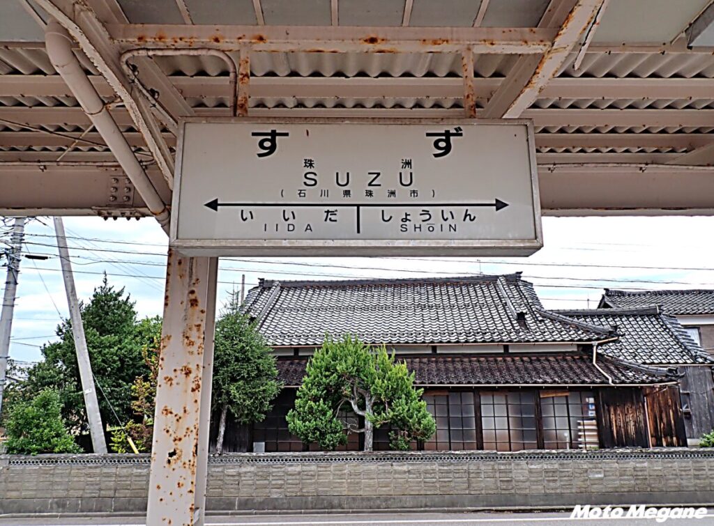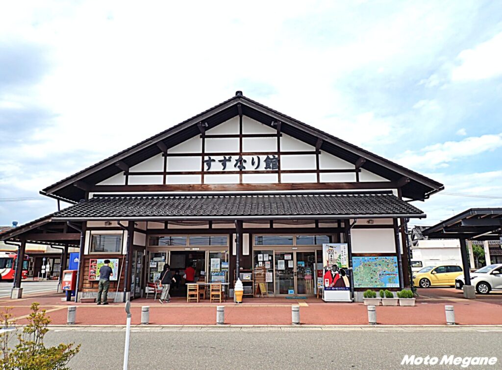『道の駅すずなり』は県道12号沿い、珠洲市中心部に位置。2005年3月で廃線となった、のと鉄道能登線の珠洲駅跡地を活用した道の駅だ。施設には、お土産販売所と観光案内窓口があるほか、タクシーやバスの待合室も設置されている。レストランや食堂はなし。道の駅建物の脇には旧珠洲駅のプラットホームと線路が残されており、自由にホームに上がることができる。
