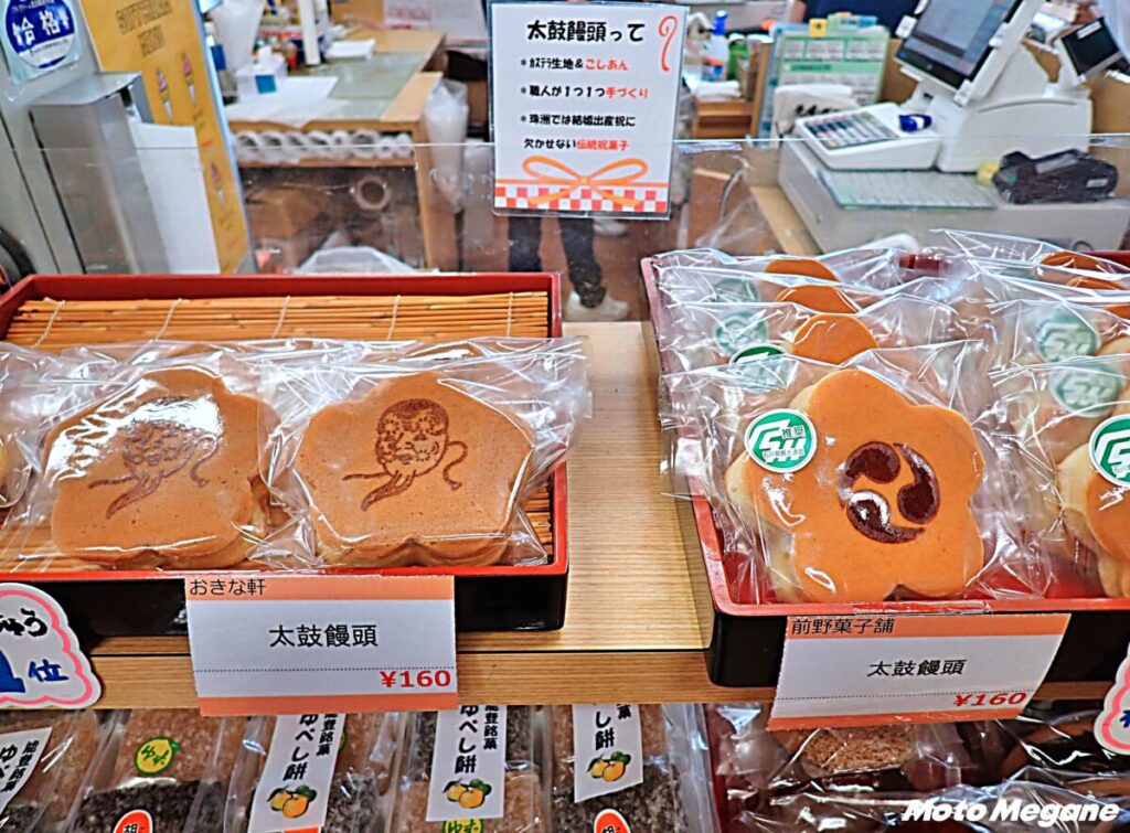 珠洲の伝統菓子。カステラ生地の中にこしあんが入った饅頭で、珠洲では結婚や出産祝いの祝い菓子に使われる。売店では市内にある菓子店数店舗の太鼓饅頭が並んでいるので、食べ比べもできる。人気No.1の和菓子で、お土産にも◎。