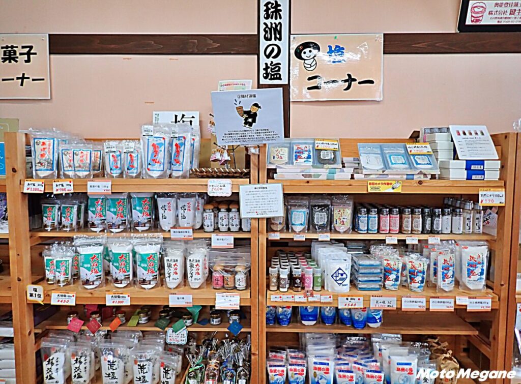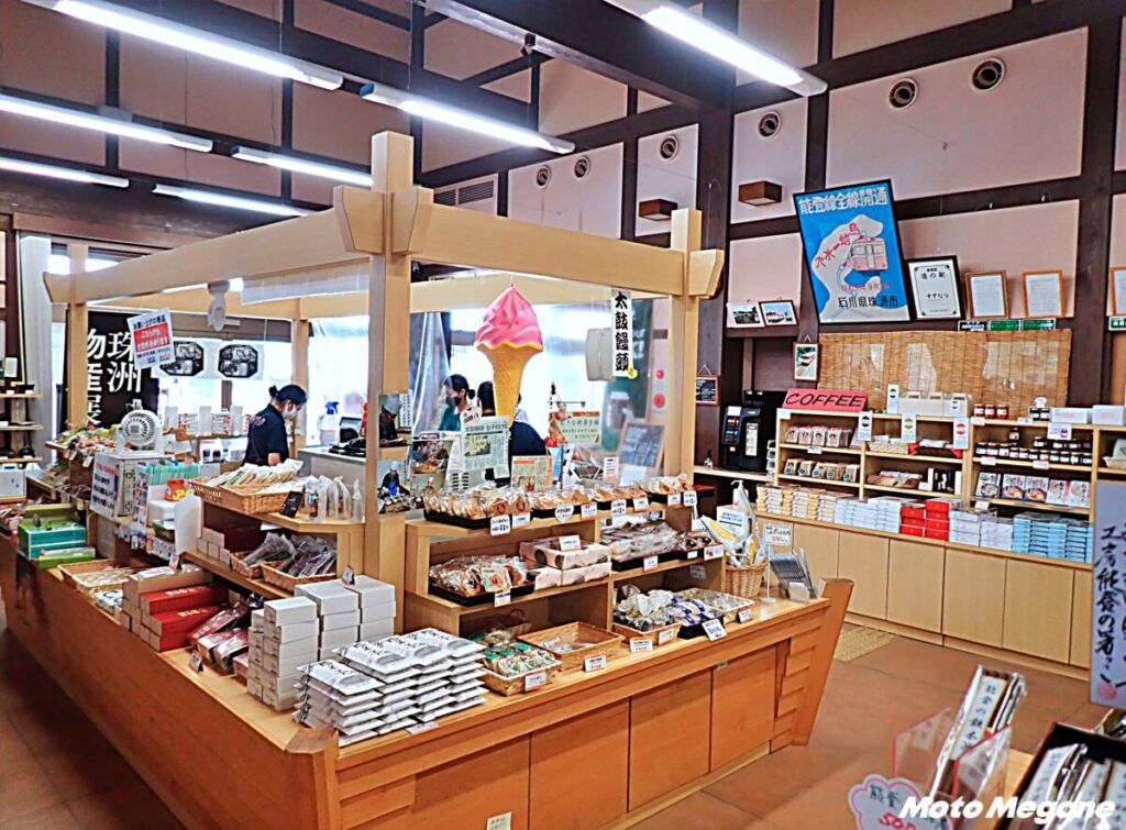 お土産販売所では、珠洲の特産品や土産品を販売。珠洲の揚げ浜塩や、地酒、菓子類などから海藻、干物などの海の幸、農産物やその加工品などの山の幸、珠洲焼などの工芸品など、地元産のものをメインに、800種以上の商品が取り揃えられている。レジでは揚げ浜塩などのソフトクリームが購入できる。