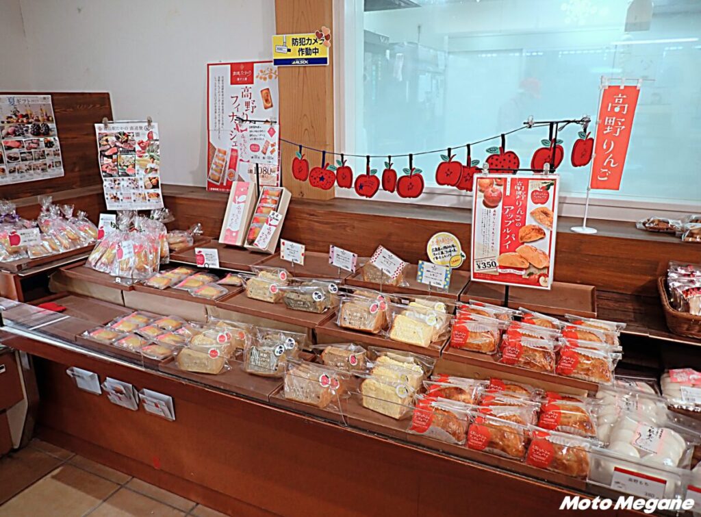 農産物直売所では、リンゴや大根、米など、高野町で育てられた旬の新鮮な農産物や加工品などを販売。リンゴのシーズンには特産の高野リンゴが店頭に数多く並び、ジュースやジャムなどの加工品や、直売所内の工房で製造されるアップルパイやフィナンシェなどの焼き菓などのリンゴ商品も豊富だ。