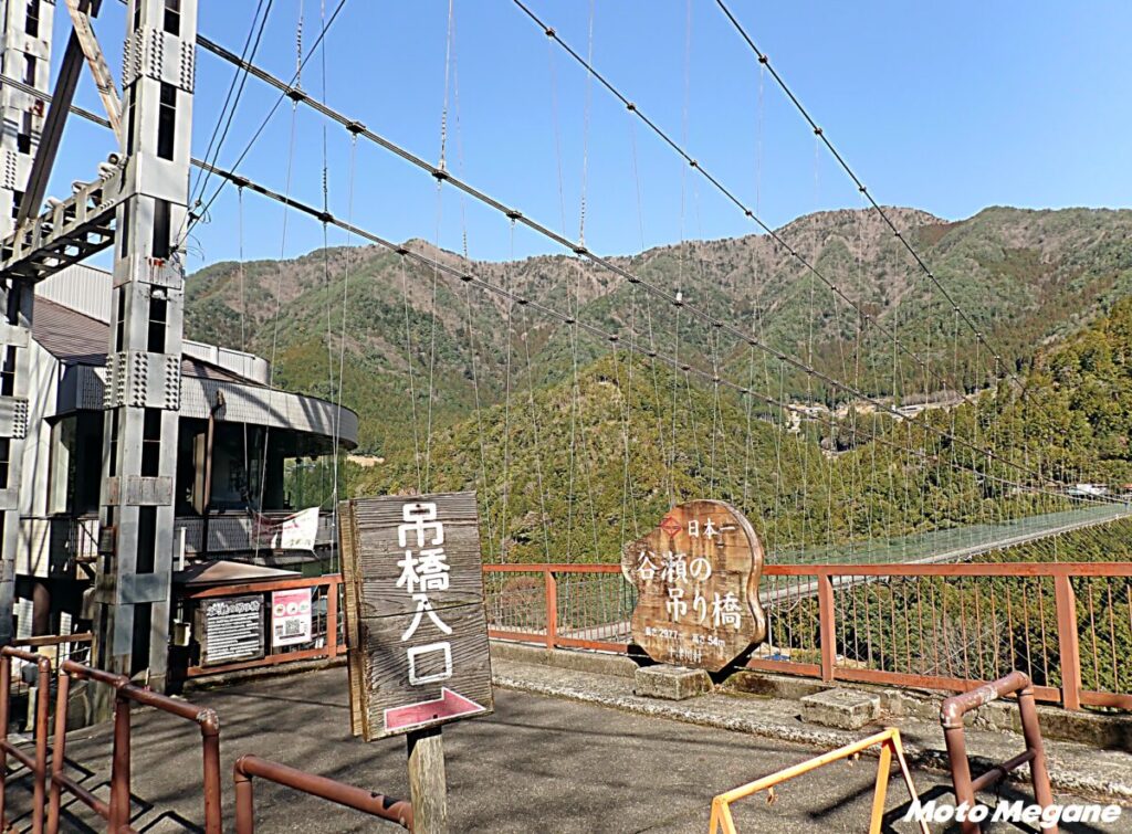 長さ297.7m、高さ54mの長さ日本一の生活用の鉄線吊り橋。熊野川にかけられており、神野地とと谷瀬を繋いでいる。吊り橋の通行料は無料。近くに村営の駐車場があるので、そこにバイクを停めて歩いて行く。駐車料金バイク400円。