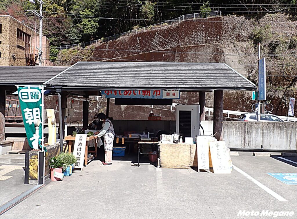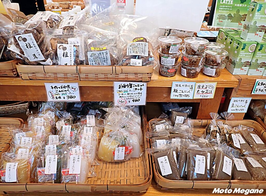 足湯隣のテントでは、土日限定で朝市も開かれる。名物の「元祖こんにゃく串」やめはり寿司、野菜や餅、漬物などを販売する。