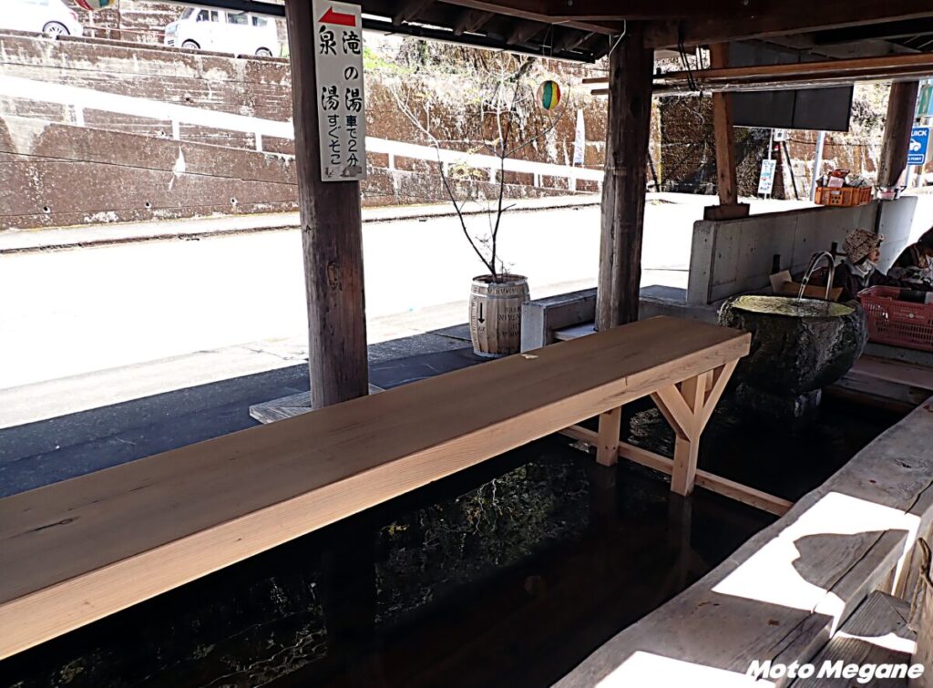 屋外には、24時間いつでも利用可能な無料の足湯が設置されている。温泉はもちろん源泉掛け流し。湯泉地温泉の源泉を使用し、泉質は単純硫黄泉でほのかに硫化水素の香りが漂っている。源泉温度が60度と少し熱めの湯だが、とてもいい湯でリフレッシュできること間違いなし。