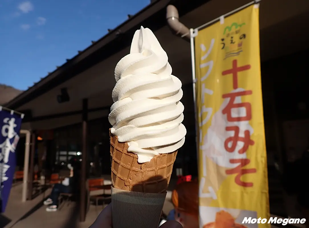 その地元産「十石みそ」を使用したソフトクリームを道の駅で食べられる。味噌のソフトクリームと聞くと驚くかもしれないが、実は「甘い」と「しょっぱい」は、とても相性が良い。バニラソフトに十石みそを混ぜてあり、一口食べるとはじめに味噌の風味が口の中に広がるが、食べていくうちに次第に甘さも感じられる。その濃厚でコクのある味わいは、例えるならチーズのようで、このクセになる甘じょっぱさなら、リピーターが多いというのも納得である。