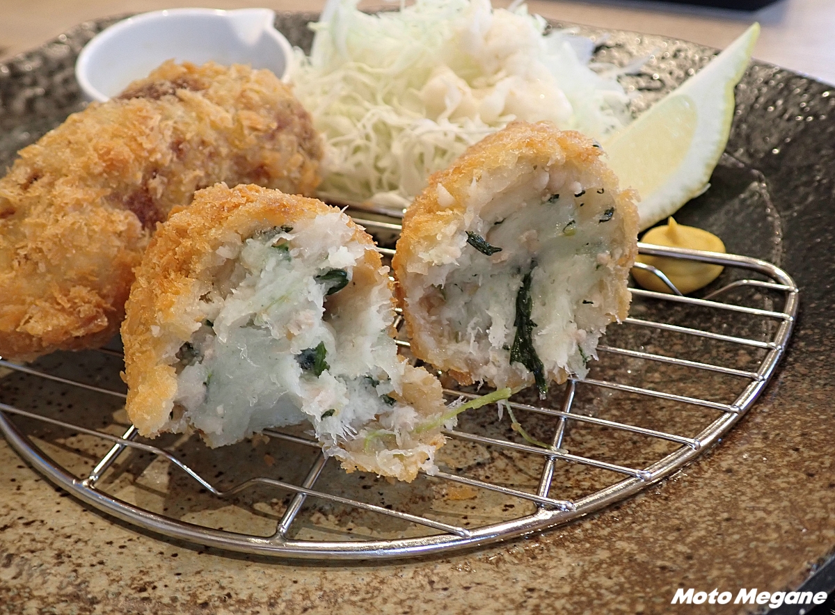 地元産の高原大根のコロッケ。大根餅をイメージして作っているそうで、少しもちっとした食感の中に大根の繊維っぽさも感じられる。じゃがいものような食感にも感じられるが、大根のみで作られているというから驚きだ。甘辛い味の“かえし”をかけて食べる。