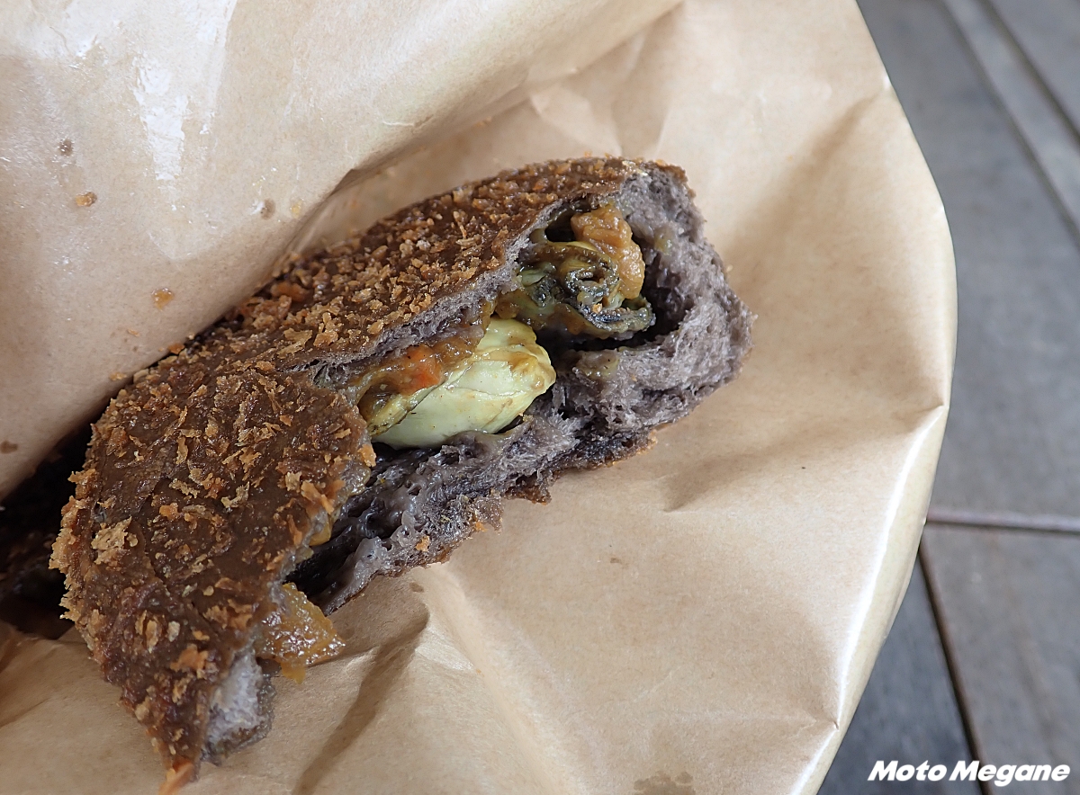 チャレンジショップ「かきまるキッチン」で提供のカレーパン。竹炭パウダーが入っており、見た目は真っ黒。中にはプリッとした三陸産の牡蠣が2つ入っており、カレーとの相性が抜群。