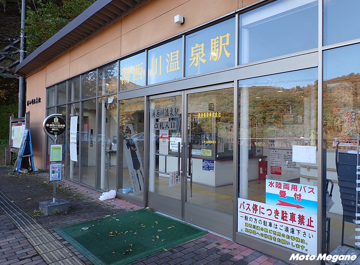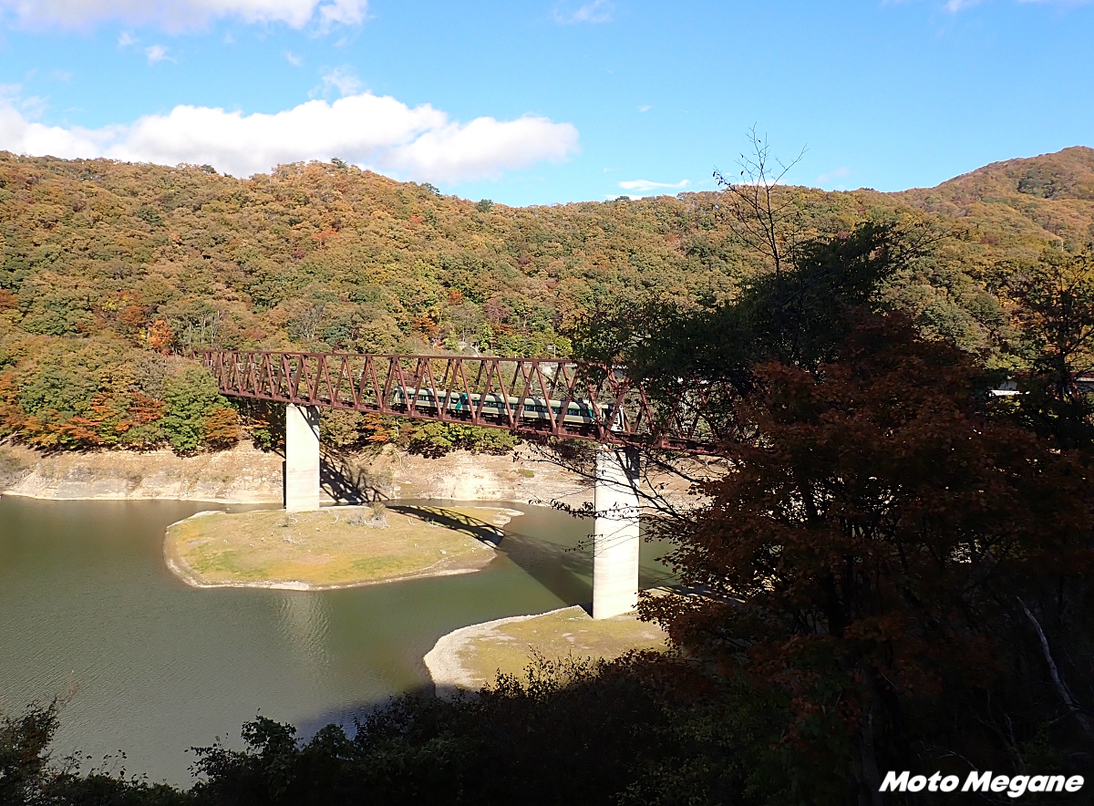『道の駅 湯西川』は、R121から県道249号線に入ってすぐの場所にあり、野岩鉄道会津鬼怒川線の「湯西川温泉駅」が隣接しているため、鉄道でもアクセス可能だ。駐車場にはバイク専用スペースも設けられている。道路を挟んで目の前には川が流れ、鉄橋を渡る電車の様子を眺めることもできる。周囲の山々や街路の紅葉も美しく、秋には景観を楽しめる。