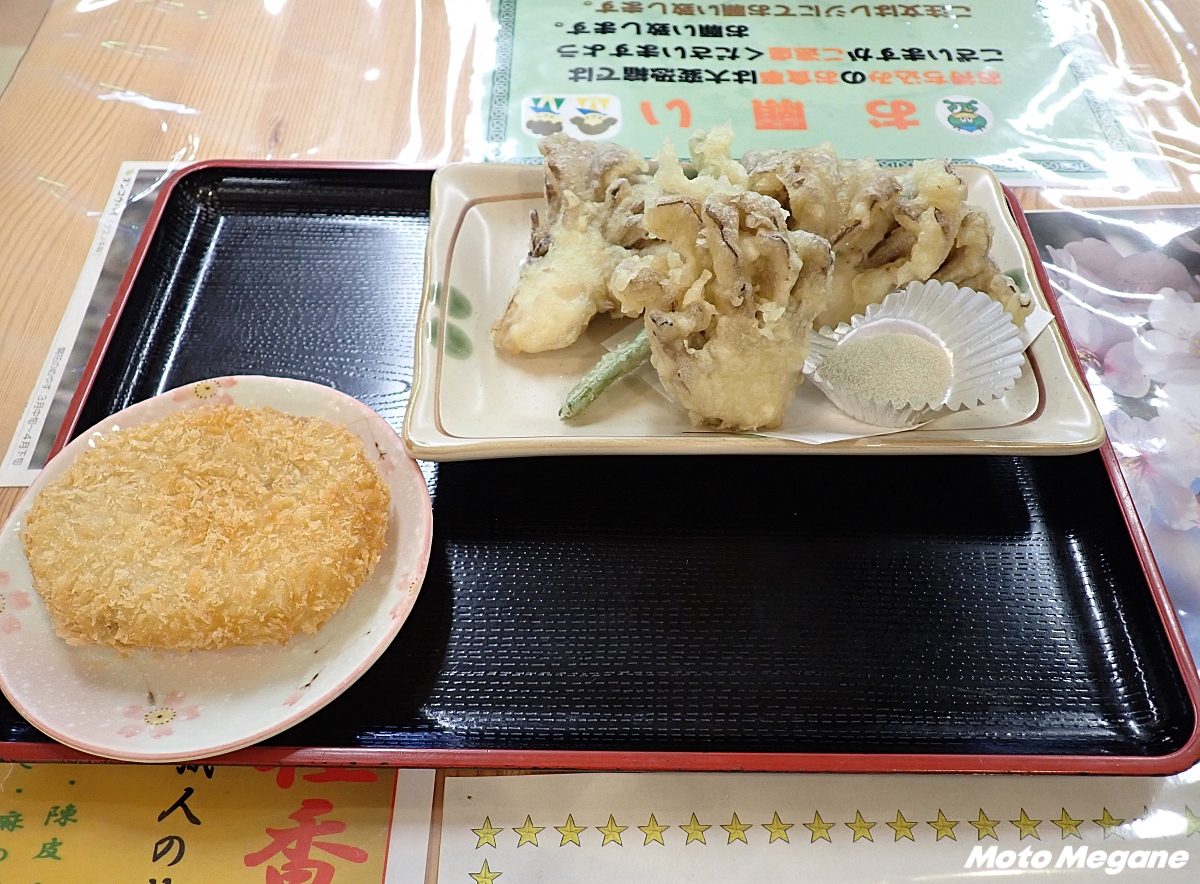 食事処では、鹿肉コロッケにカレーをかけた「鹿コロ丼」や「ゆば入り鴨せいろそば」などのオリジナルメニューや地粉蕎麦などの麺類を楽しめる。季節物で舞茸の天ぷらや鹿コロッケの単品メニューもあり、ご当地ならではの味を満喫できる。
